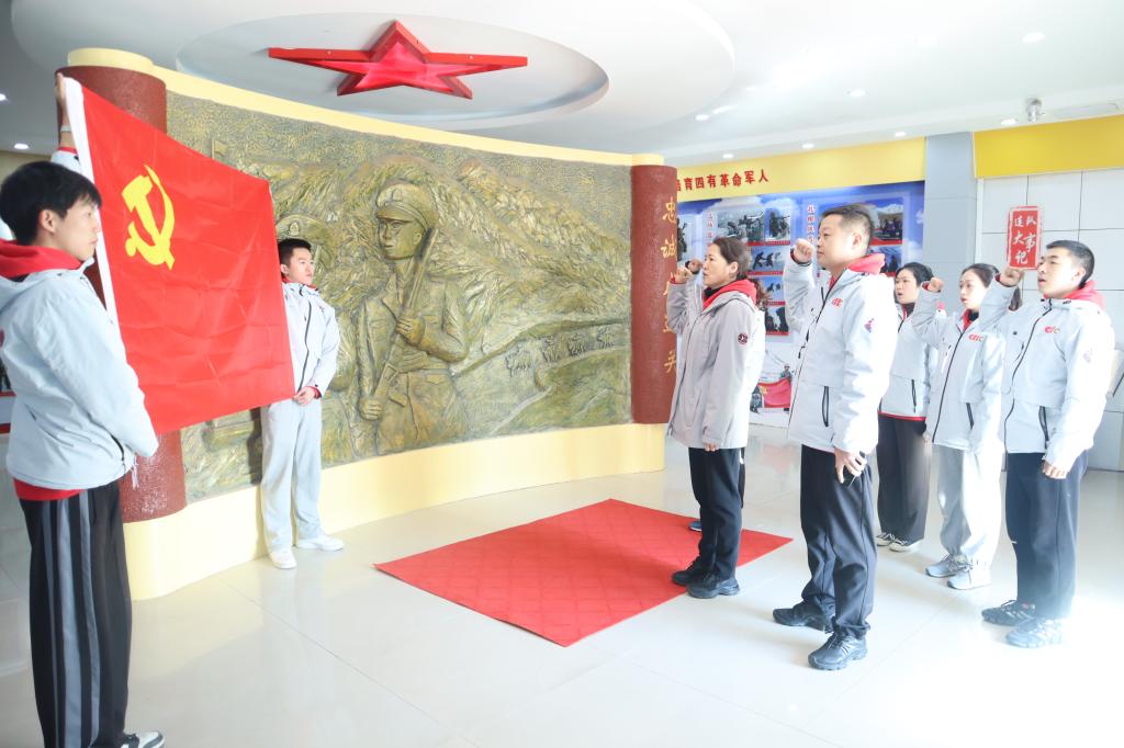 参观结束后,杨玲带领全体党员在荣誉馆铜雕和党旗前重温入党誓词,神情庄重,声音铿锵,铮铮誓言彰显共产党人的初心使命,更是提醒着师生以共产党员身份为荣,赓续如戍边战士一般的大无畏奋斗精神与奉献精神。
