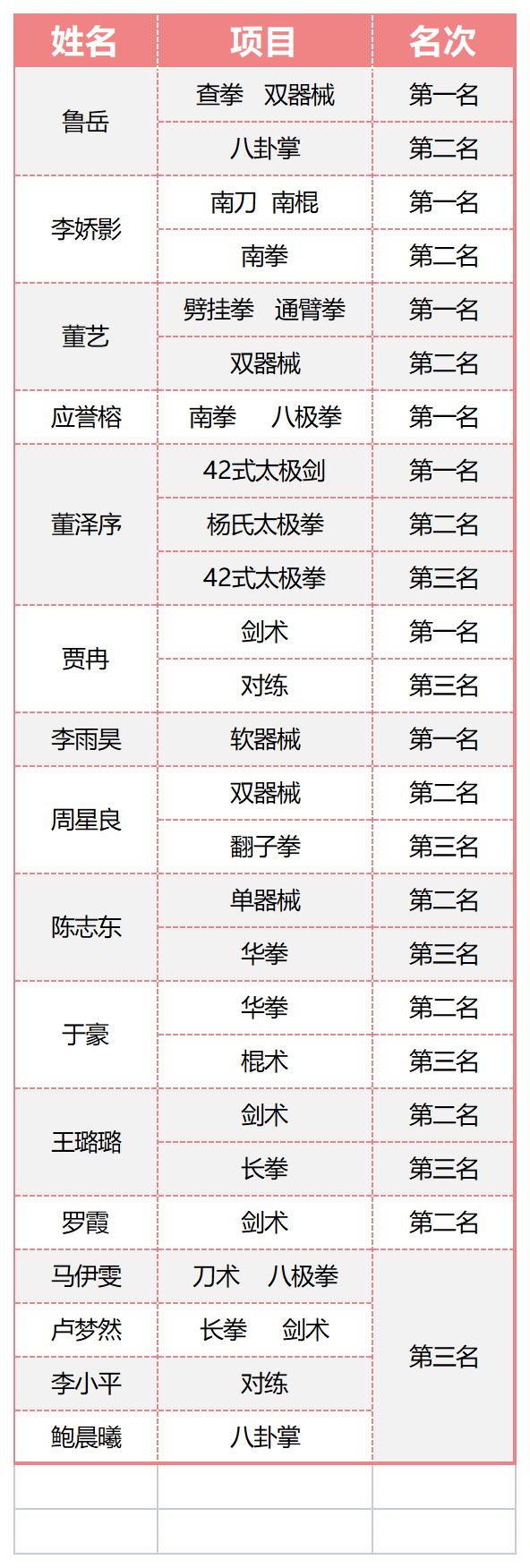 本次比赛我院共派20人参赛,丙组、丁组各参赛十人。在校领导、教务处、武术学院等有关部门的重视与关心支持下,教练员席饼嗣老师的带领下,男女组运动员们不惧挑战充满斗志地在赛场上努力拼搏、超越自我,展现出自信、奋发的精神风貌。场下队友之间相互鼓励、呐喊助威最终取得了男子丙组B组团体第二!女子丁组团体第三的优异成绩!
