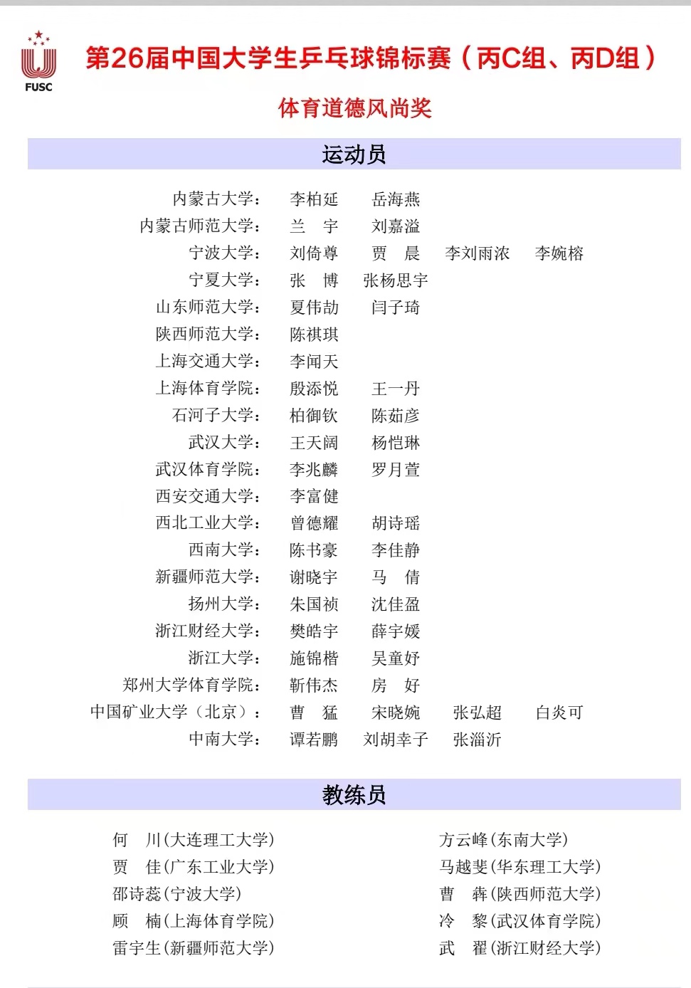 本网讯 第26届中国大学生乒乓球锦标赛(丙C、丙D组)于4月8日至4月14日在江苏省南通市中国乒乓球通州训练基地举办。本次比赛由中国大学生体育协会主办,中国乒乓球通州训练基地承办。赛事汇聚了国内顶尖的大学生乒乓球运动员,共有来自北京师范大学、上海交通大学、吉林大学、广西大学、新疆师范大学、浙江大学等51所高校的500名大学生运动员参赛,进行了男子团体、女子团体、男子单打、女子单打、男子双打、女子双打和混合双打7个项目的角逐。
