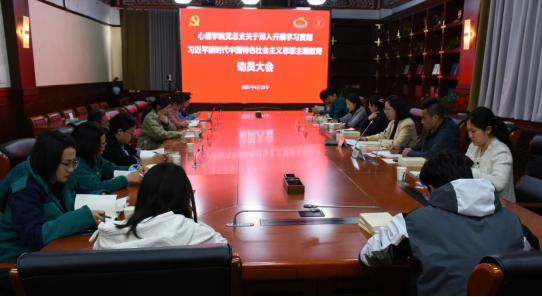 心理学院党总支书记梅朵传达了学校党委关于主题教育会议精神,对心理学院党总支开展主题教育进行了动员部署。她指出,一是要提高政治站位,深刻领会开展主题教育的重大意义。师生党员要牢牢把握“学思想、强党性、重实践、建新功”的总要求,坚持“学思用贯通、知信行统一”的根本任务。要深刻认识到本次主题教育对推动学校及学院办学事业的现实意义,要在现有成果基础上,继续为学院学科建设发展凝心聚力、踔厉奋发。