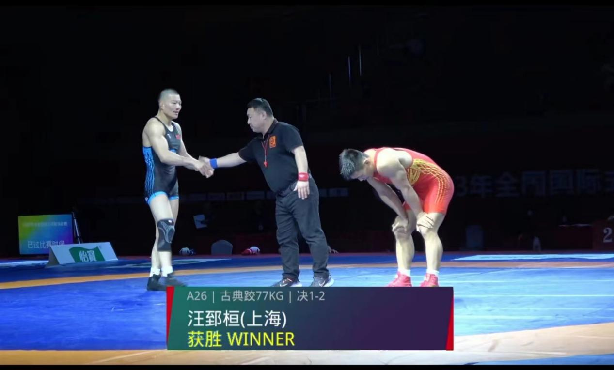 汪郅桓在决赛中和山东运动员展开了激烈的对抗,汪郅桓在2:1落后的不利情况下,最后以5秒的绝杀夹颈摔和强大的心理战术反败为胜,蝉联该级别两年金牌。