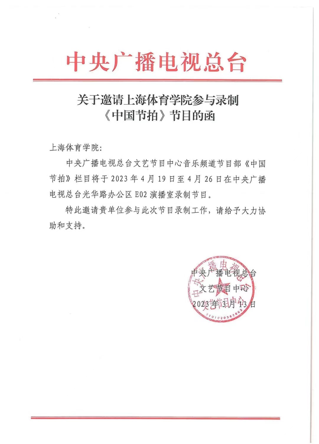 中央广播电视总台文艺节目中心音乐频道《中国节拍》栏目作为一个“全民共舞、全民互动”的音乐舞蹈节目,扎根人民,扎根基层,反映百姓日益丰富的精神文化生活。将新时代中国人民群众对美好生活的向往以音乐、舞蹈的形式呈现出来,反映全面建成小康社会伟大进程中基层人民日益丰富的精神文化生活。