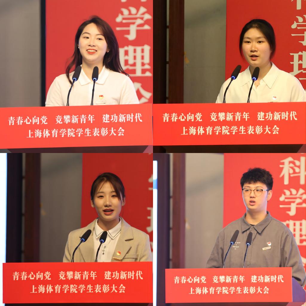 艺术学院俞洋、中国乒乓球学院吴依蔓、竞技运动学院马晓晨、运动健康学院杜书豪作为获奖学生代表围绕乡村振兴的社会实践、边疆推广体育运动的责任担当、学科和体育赛事多元发展、扎根实务的学术科研等方面进行了成长感悟分享,他们以自己的亲身经历作为典范示范,鼓励身边更多的同学立鸿志,敢奋斗,成为民族文化的传承者、体育事业的推动者、国家和民族进步的捍卫者、自身命运的主宰者、行业发展的引领者,实现自己人生的价值。