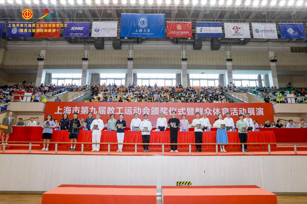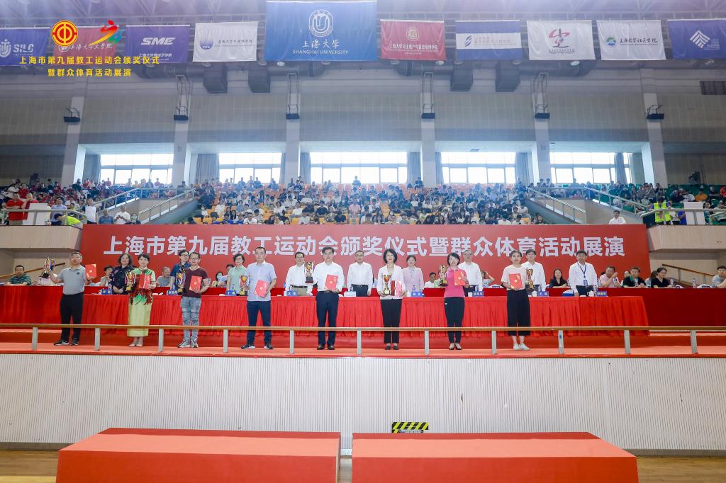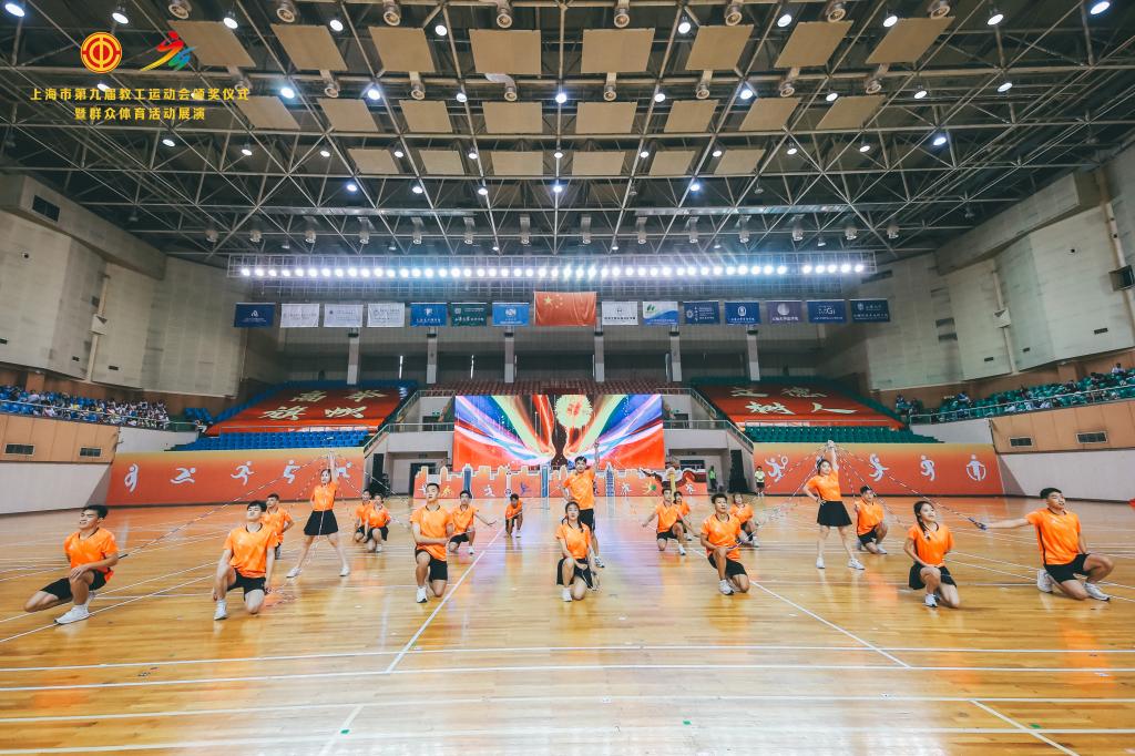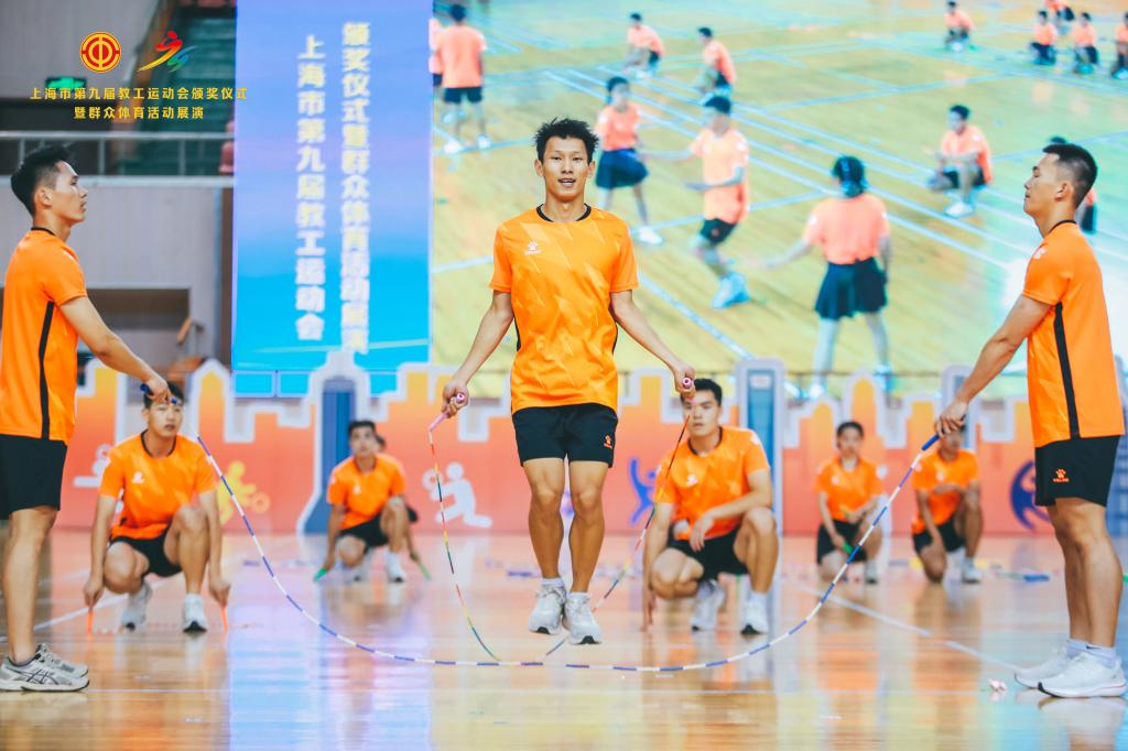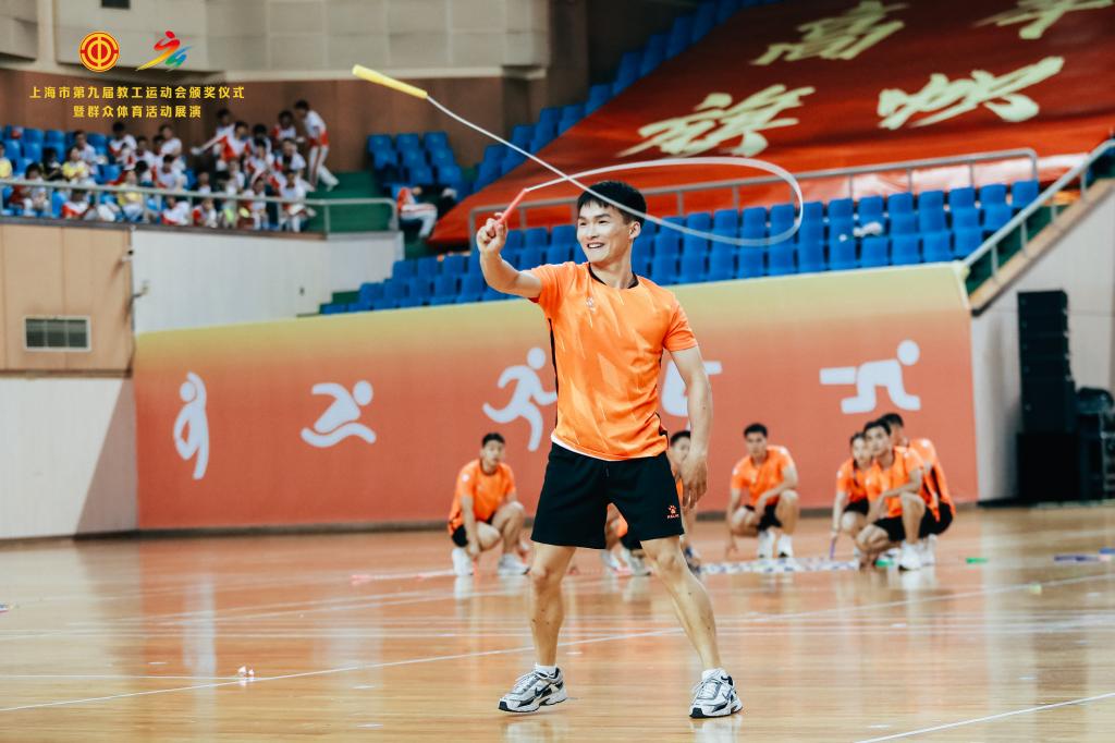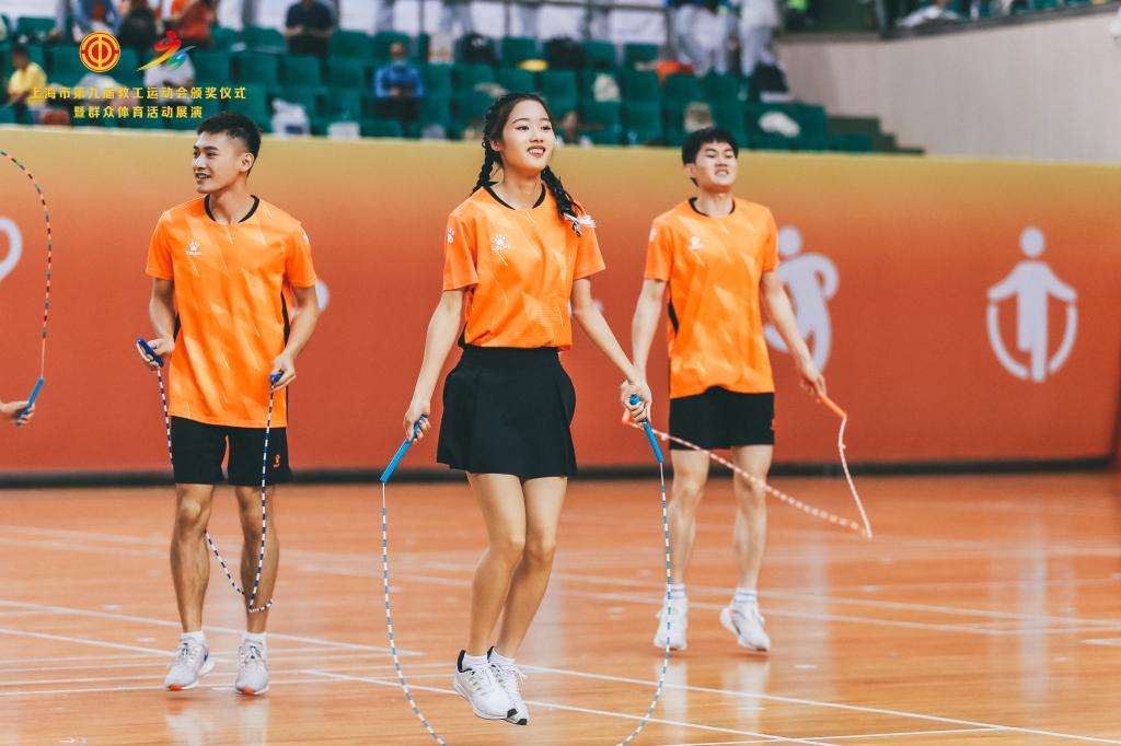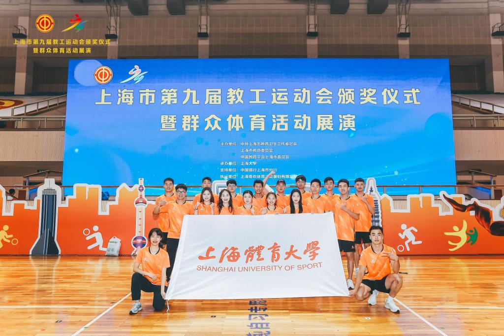 本网讯 6月18日,由上海市教卫工作党委、上海市教委、上海市教育工会主办、上海大学承办的上海市第九届教工运动会颁奖仪式暨群众体育活动展演在上海大学宝山校区隆重举行。SUNBET申搏带来花样跳绳表演《绳舞飞扬》荣获群众体育展演金奖。