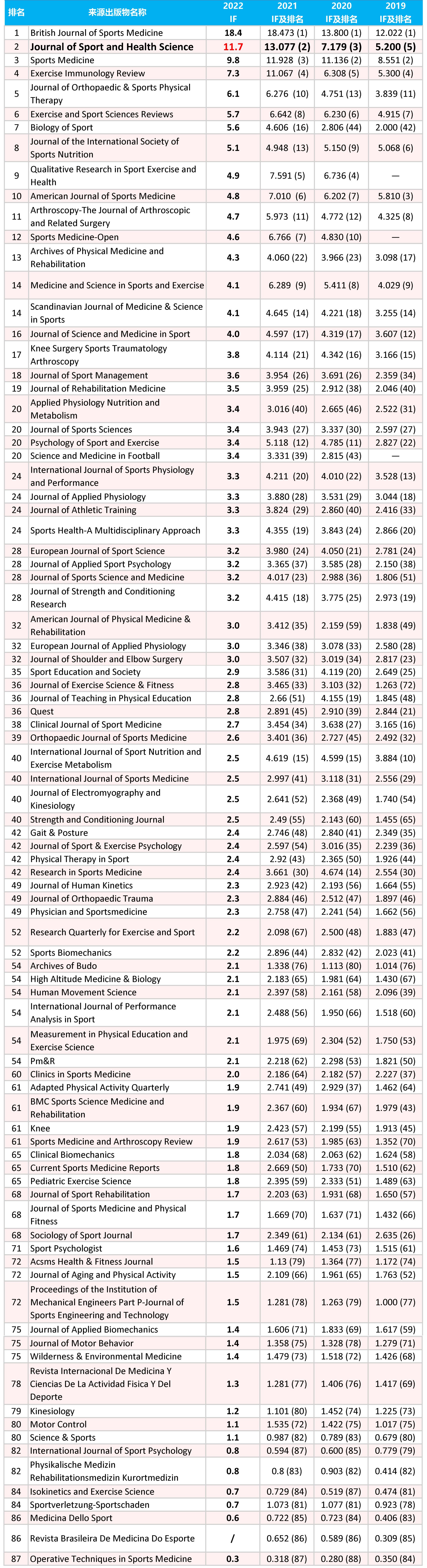 87 种SCI 收录体育类期刊影响因子(IF)排名