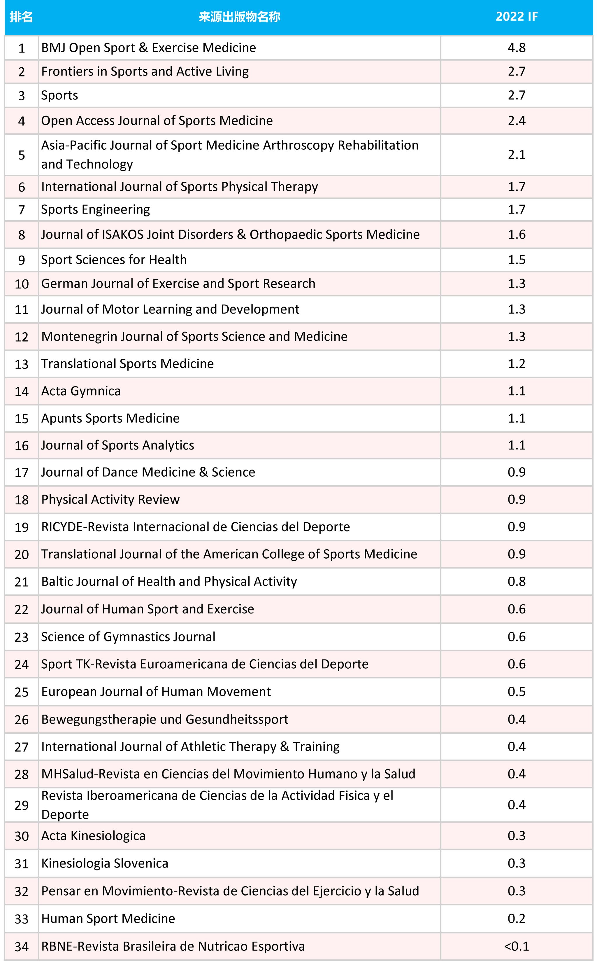34 种ESCI 收录体育类期刊影响因子(IF)排名