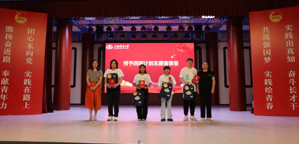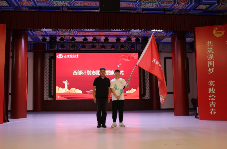 校党委组织部副部长蒋啸天为西部计划志愿者代表授总旗。