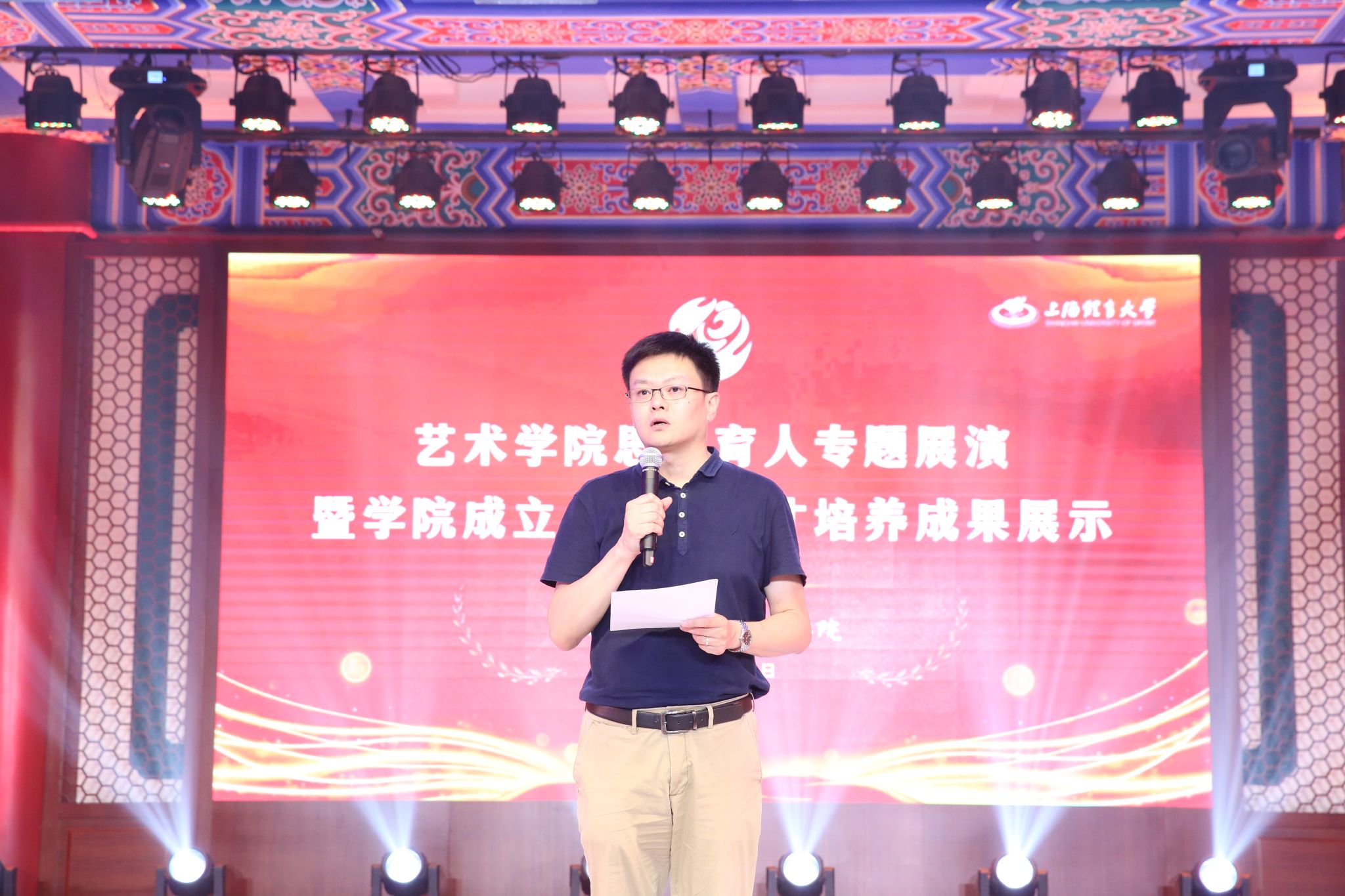 学校党委常委、组织部部长张盛为展演活动致辞,张盛对于艺术学院在思政育人、比赛展演、创新创业、就业升学等方面的工作给予充分肯定,对艺术学院教师的敬业精神和学生的专业素养给予高度认可。回首过去,展望未来。张盛也对各位艺院学子提出了新的期待,对旭日初升的上体艺院寄予美好祝福。