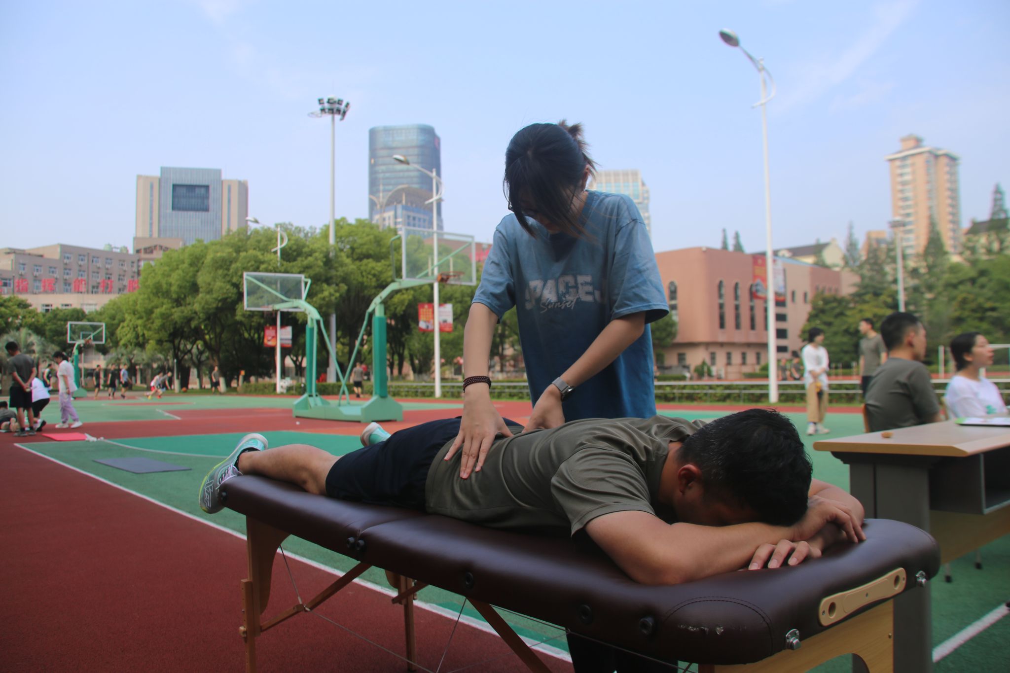 在康复义诊环节,实践队伍成员袁紫寒、李兰倩、谢一鸣等同学对国防大学的学员们进行了现场问诊与康复实操,针对膝关节积液、腰肌劳损、踝关节扭伤等常见的运动损伤问题,进行了详细的讲解,并提供和演示了可行的解决方案。现场的几位同学还分享了相关手法,让国防大学的学员们可以尝试自己进行简单的运动康复训练。