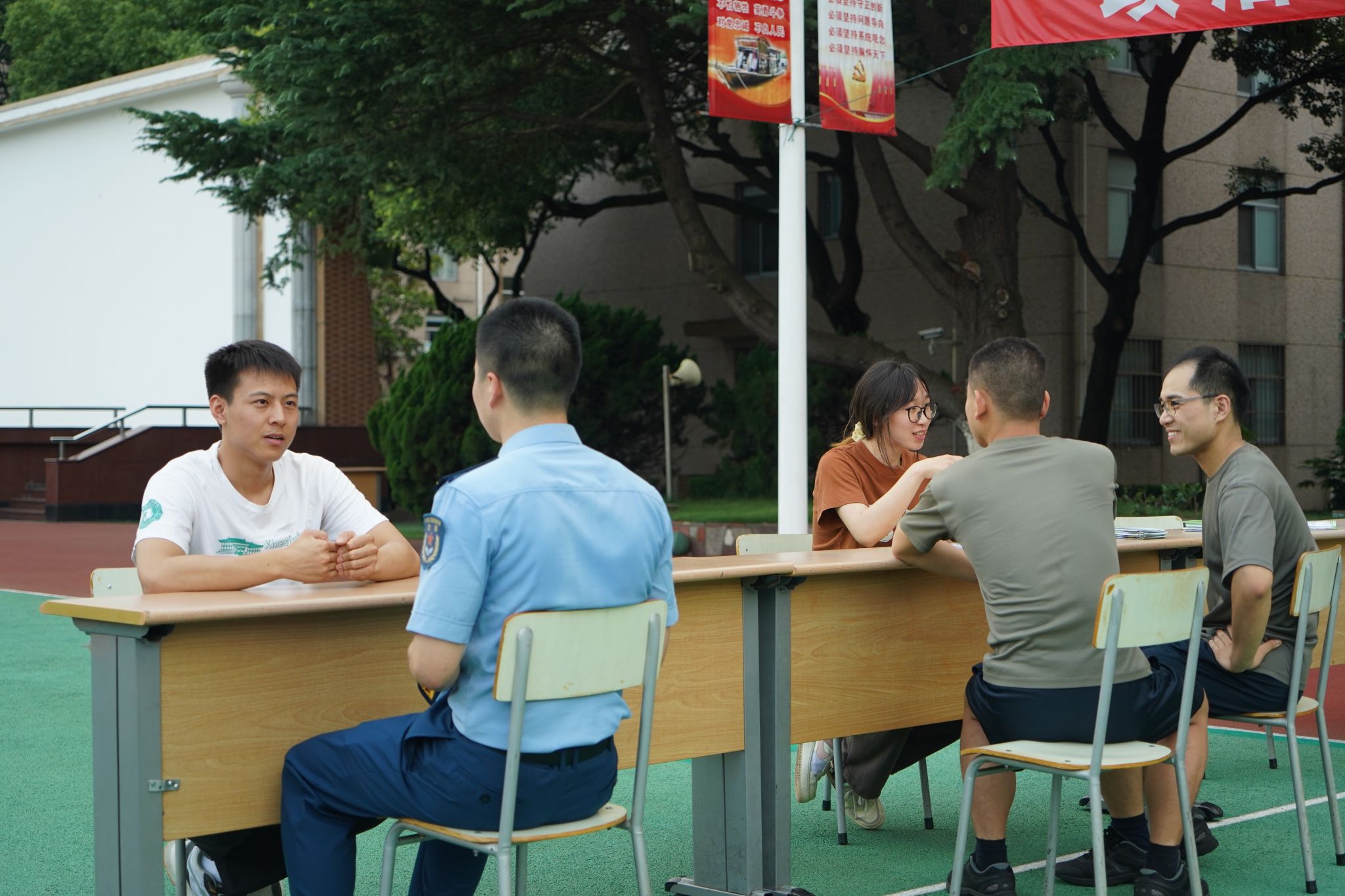 本网讯 为促进与军事院校的友好合作、表达对驻地官兵学员的关怀,以专业知识的实际行动支持国防建设、推动军地院校之间的交流,2023年7月1日下午,运动健康学院前往国防大学政治学院开展了以“运动康复进校园 科普训练齐发声”为主题的暑期社会实践活动。国防大学政治学院四大队教导员叶锋、学员陈政等接待了实践队伍的全体成员。运动健康学院团委书记汤含雨、本科生党支部书记雷越、本科生辅导员唐雅洁,25名本科生实践队伍成员、国防大学政治学院四大队的部分学员共同参与了本次实践活动。