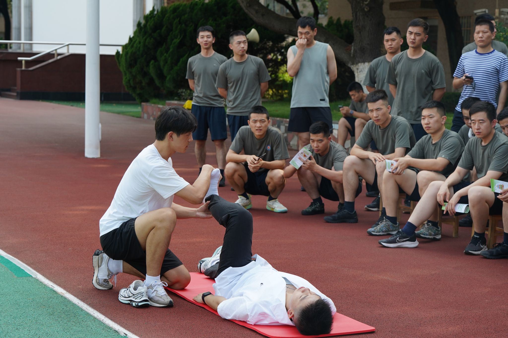 在简单的开场后,本科生实践队伍成员贾涛、徐爱迪进行了“训练后的肌肉拉伸和放松”相关知识的介绍与演示,让国防大学的学员们对实施肌肉拉伸的专业动作要领有了更加深入系统的认识。