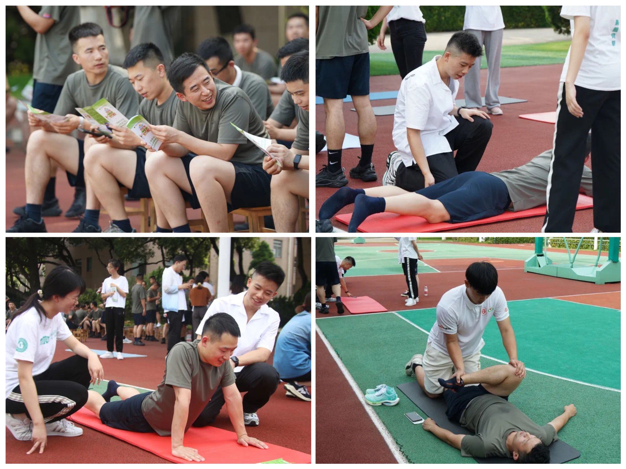 在完成以上部分的介绍与演示后,国防大学的学员们饶有兴致地加入到实地体验的过程中,在实践队伍成员们的专业指导下,学员们陆续尝试进行自我肌肉拉伸和放松的实操。实践队伍成员们也时刻关注着每一位学员,不时进行标准化的康复动作指导和规范,让大家都可以学习掌握到动作要领,能够更加科学地进行肌肉拉伸和放松训练。