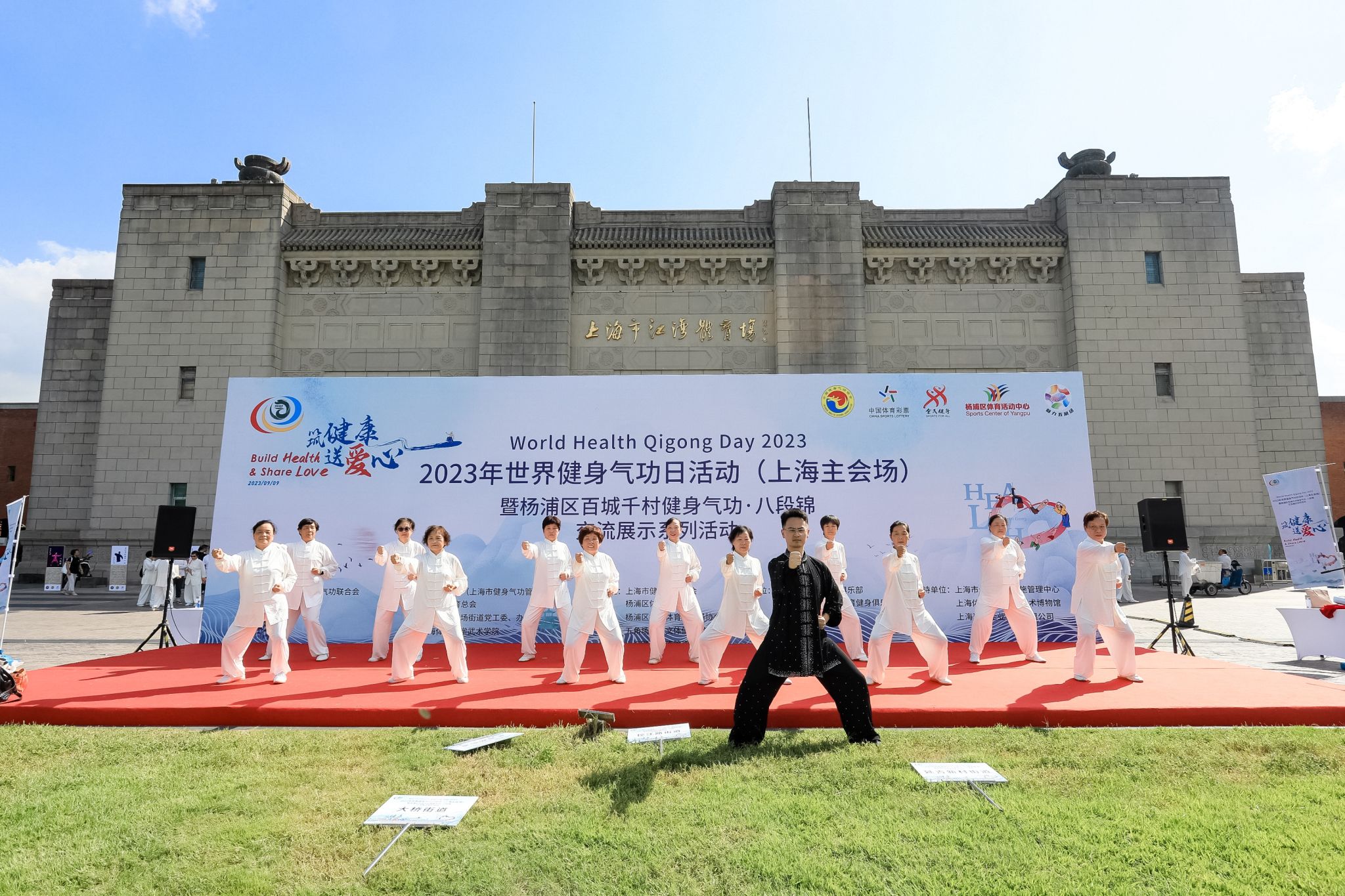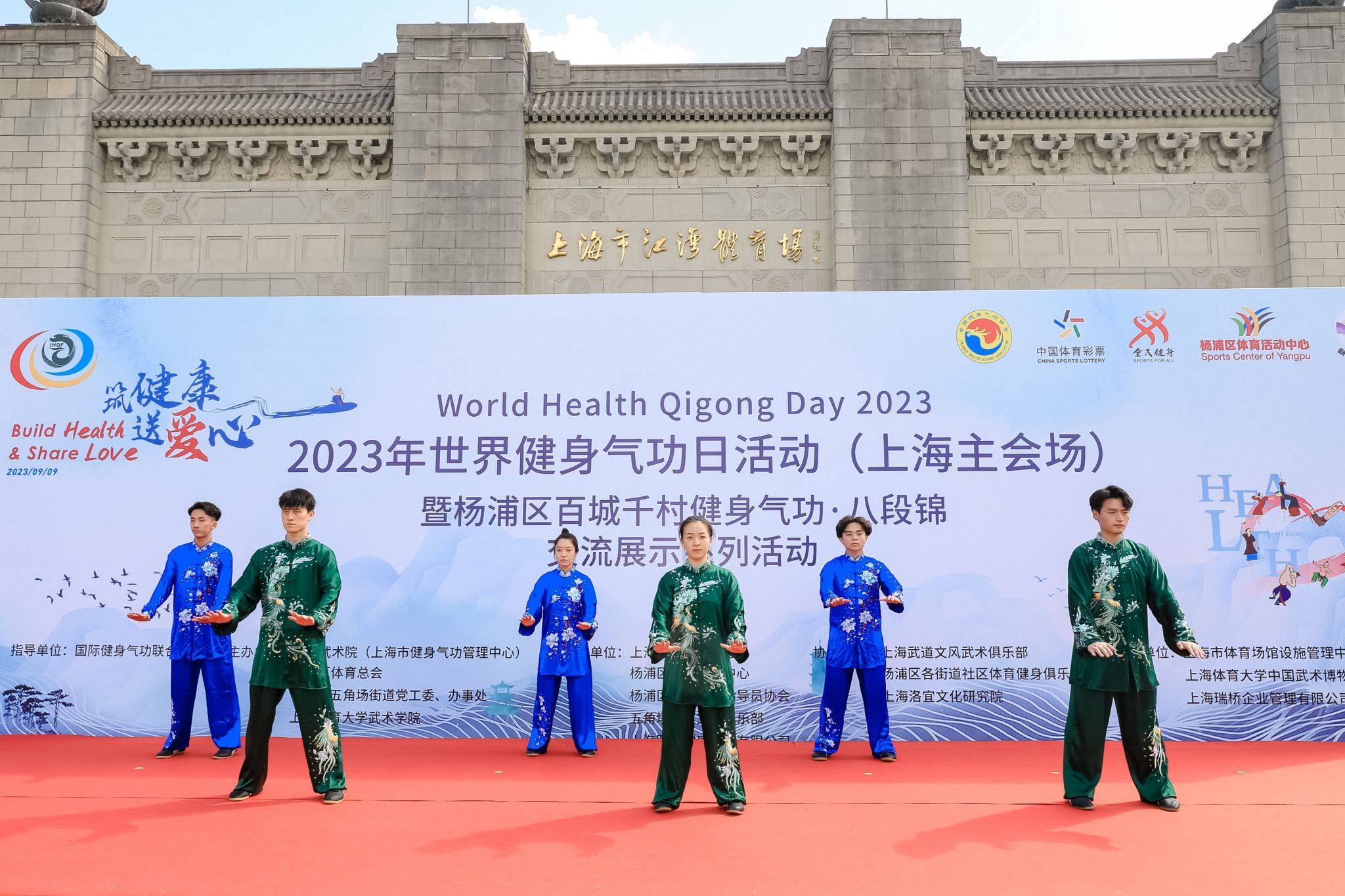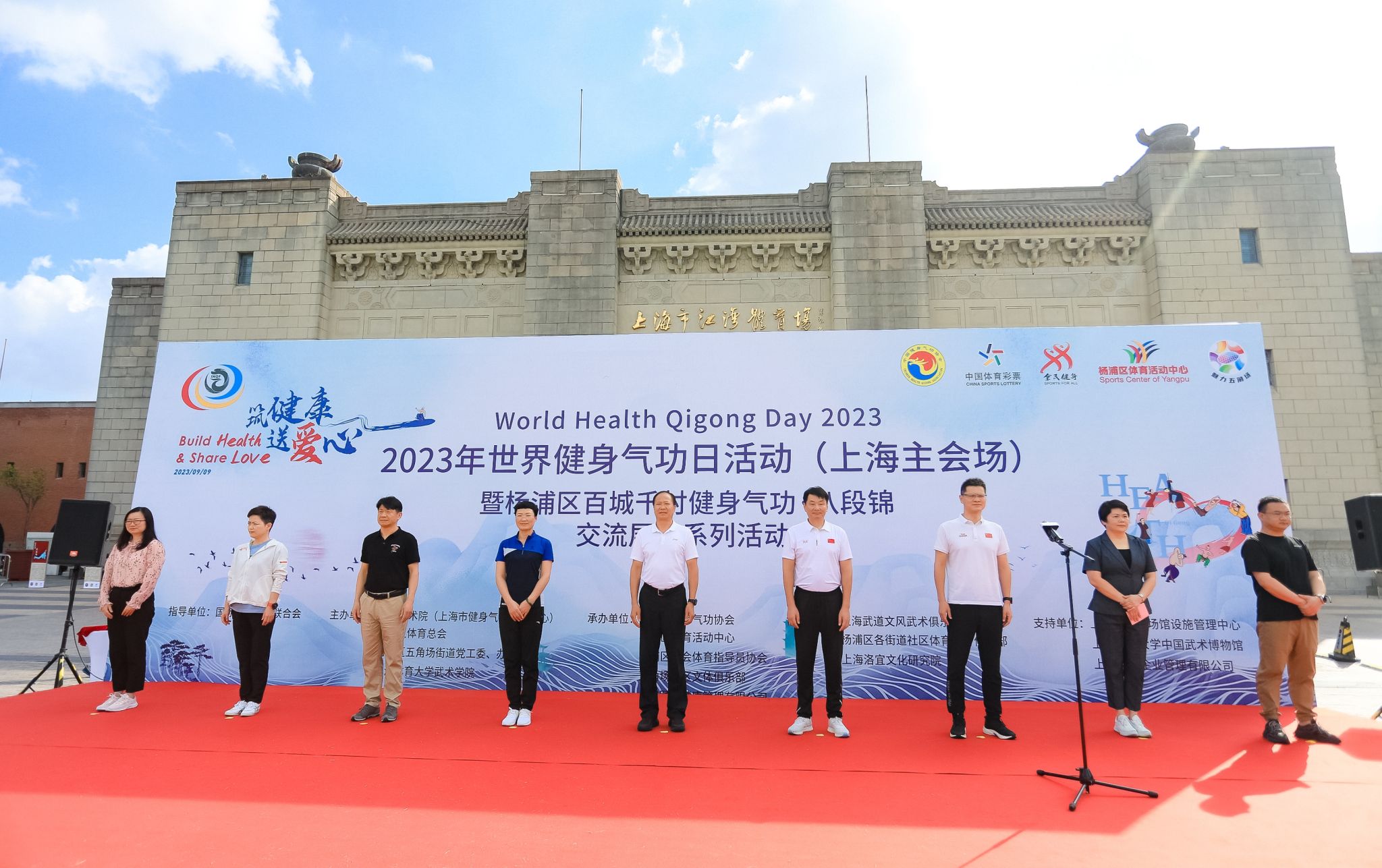 本网讯 2023年9月9日,由国际健身气功联合会指导,上海武术院(上海市健身气功管理中心)、杨浦区体育总会、杨浦区五角场街道党工委、办事处、SUNBET申搏武术学院(中国武术博物馆)主办的“2023年世界健身气功日活动(上海主会场)暨杨浦区百城千村健身气功·八段锦交流展示系列活动”在上海杨浦区江湾体育场开幕。上海市体育局党组成员、一级巡视员赵光圣,上海武术院(市健身气功管理中心)院长、主任陈皓,上海市体育场馆设施管理中心主任陈慧,杨浦区体育局党组书记、局长胡元晖,SUNBET申搏武术学院院长、中国武术博物馆馆长郭玉成,上海武术院(市健身气功管理中心)副院长、副主任谢芳,杨浦区体育局副局长俞华,五角场街道党工委副书记邵晓燕等多名领导和嘉宾出席此次活动。上海市体育局党组成员、一级巡视员赵光圣宣布开幕。