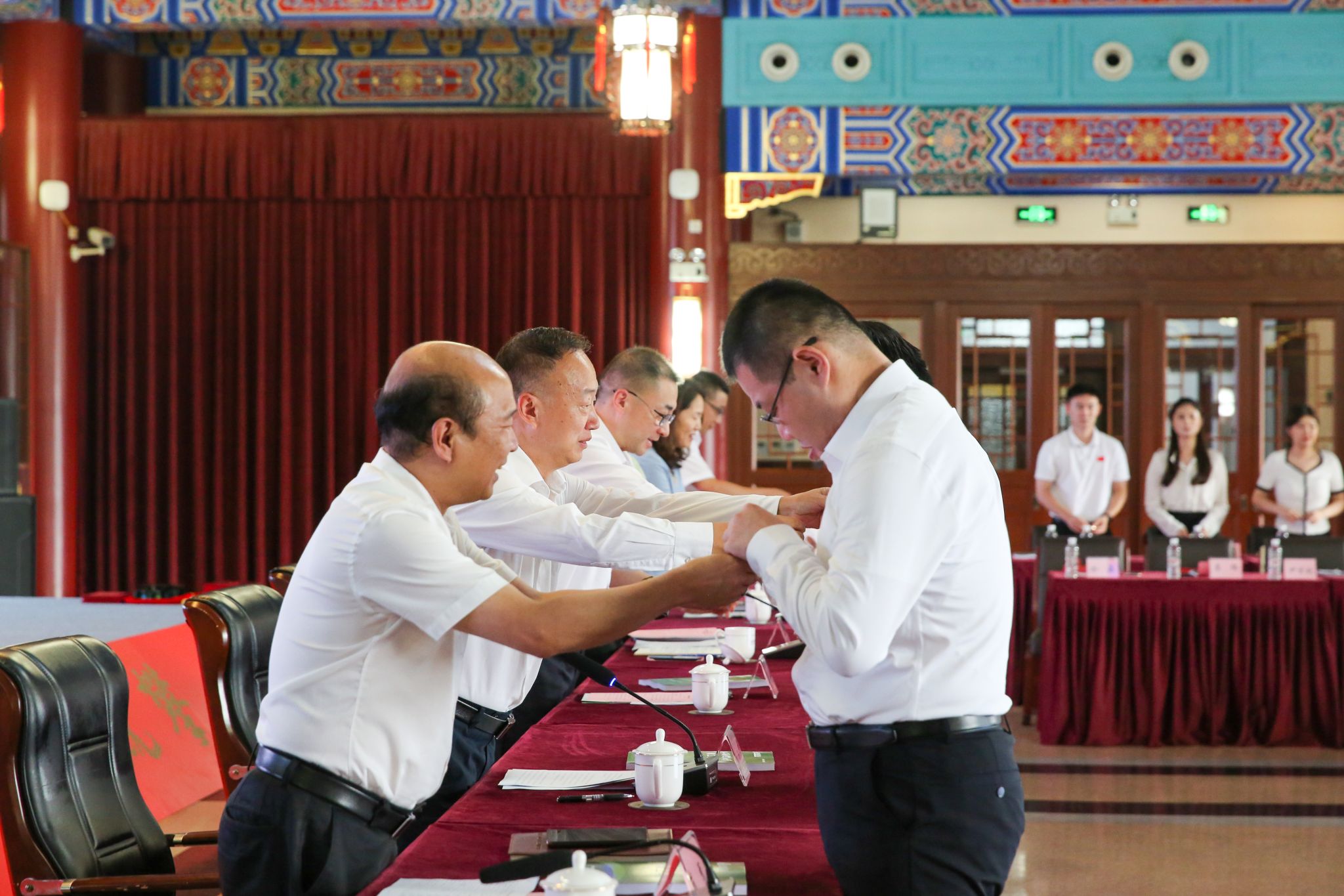 为加强师德仪式教育,现场举行了新教师入职宣誓仪式,副校长唐炎领誓。高举紧握的拳头,饱含深情的眼神,铿锵有力的声音,铮铮誓言响彻绿瓦,表达了坚守教育初心,勇担育人使命的决心。同时,校领导为新教师代表佩戴校徽并颁发教工手册,小小的校徽和实用的手册代表着沉甸甸的责任,承载着长者的期许,更蕴含着绿瓦精神的传承与弘扬。