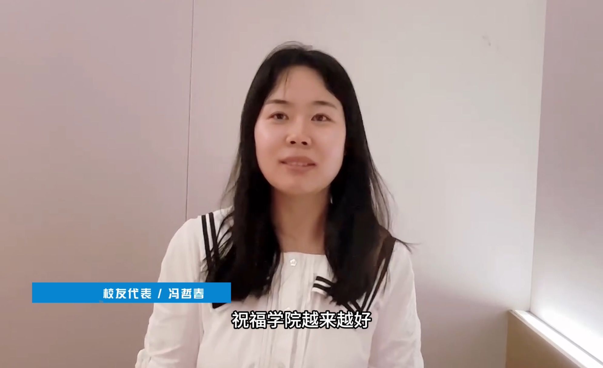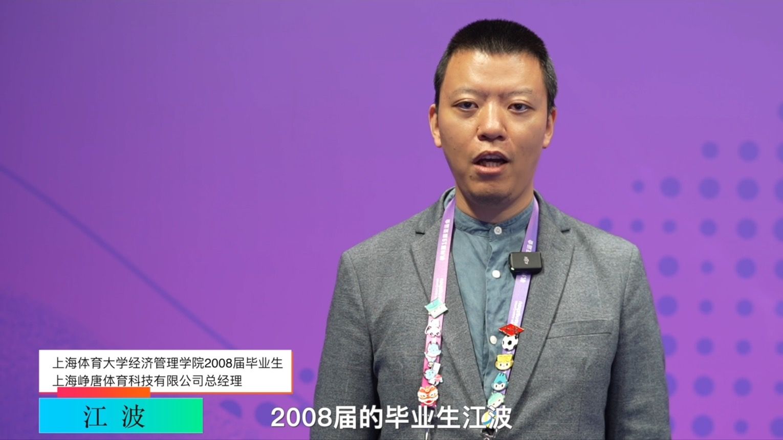 校友代表2008届市场营销本科毕业,目前负责亚运会以及亚残运会部分赛事体育展示和颁奖仪式的上海峥唐体育科技有限公司总经理江波、2018届体育管理硕士毕业五年全程参与亚运会筹办工作的冯喆春通过视频表达了对新生的期望和对学院的深切祝福。