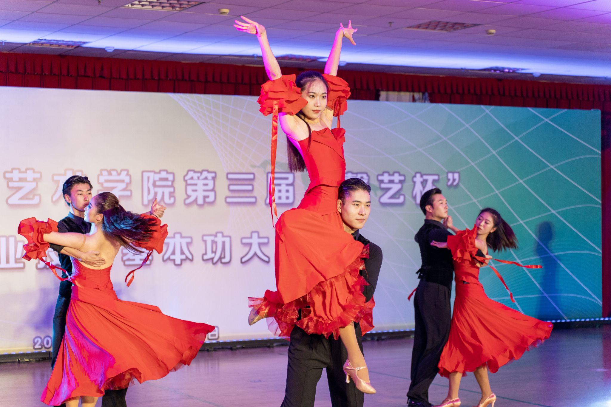 参加比赛的同学尽情发挥自己的专业技能,场上热情洋溢,场下气氛高涨,现场欢呼声和掌声一浪高过一浪。经过多个环节的激烈比拼,本届大赛最终决出了标准舞单人二项、标准舞单人三项、拉丁舞单人二项、拉丁舞单人三项、标准舞双人二项、拉丁舞双人二项、拉丁舞双人三项、中国民族民间舞、中国古典舞、古典芭蕾舞、现场报道、主持、表演等13个项目共56个小项的优胜奖项和名次。来自SUNBET申搏艺术学院和上海电影职业艺术学院的将近100名同学获得了奖项和荣誉。