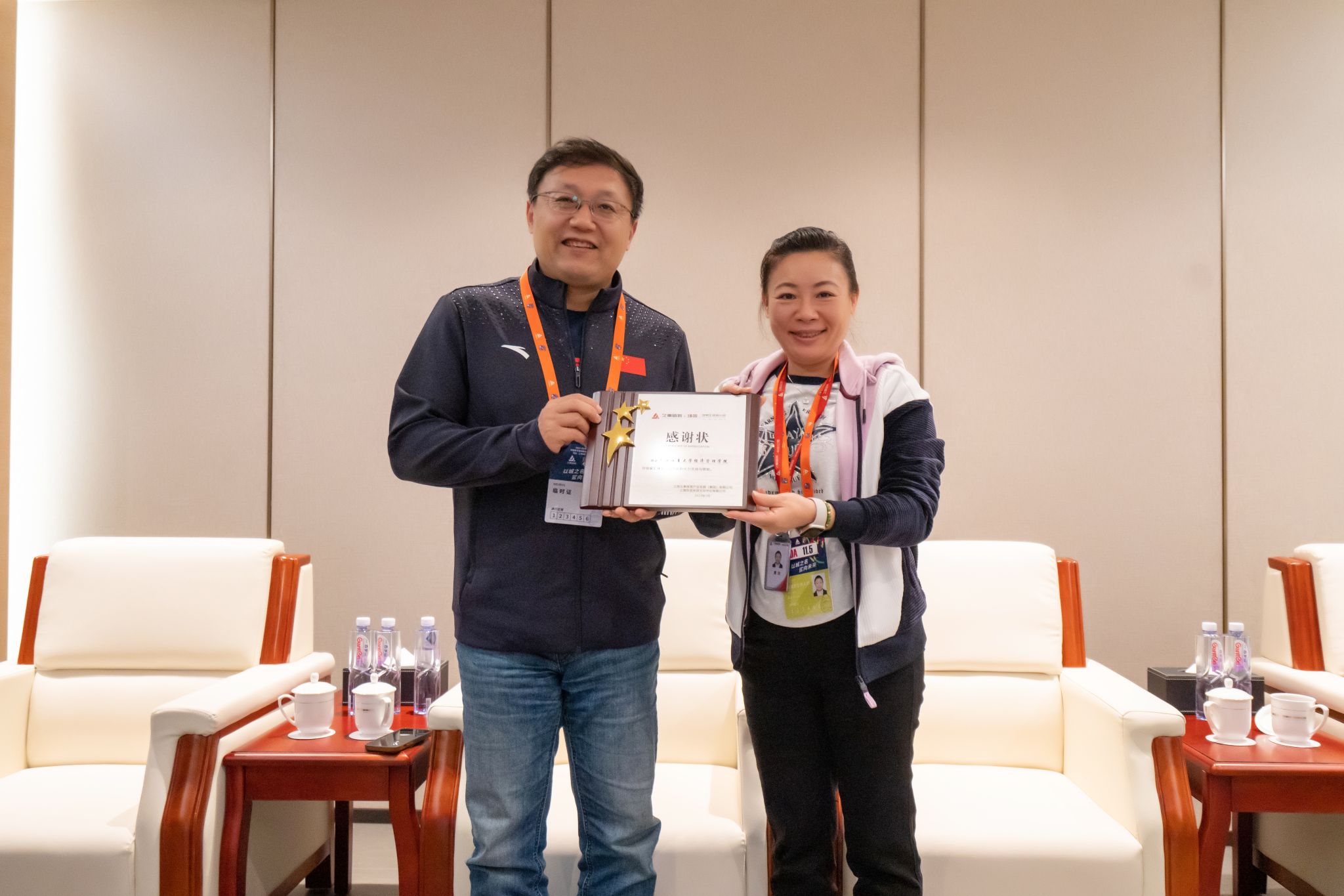 久事体育中心公司唐玫书记向李海院长授感谢牌,表示在合作过程中,欣喜地看到了经管学子专业、爱岗、敬业精神,体现出了极高的专业素养,为赛事的成功举办发挥了重要作用,并对学院长期以来在体育场馆运营管理、大型赛事组织策划、服务保障等方面给予的支持表示感谢。