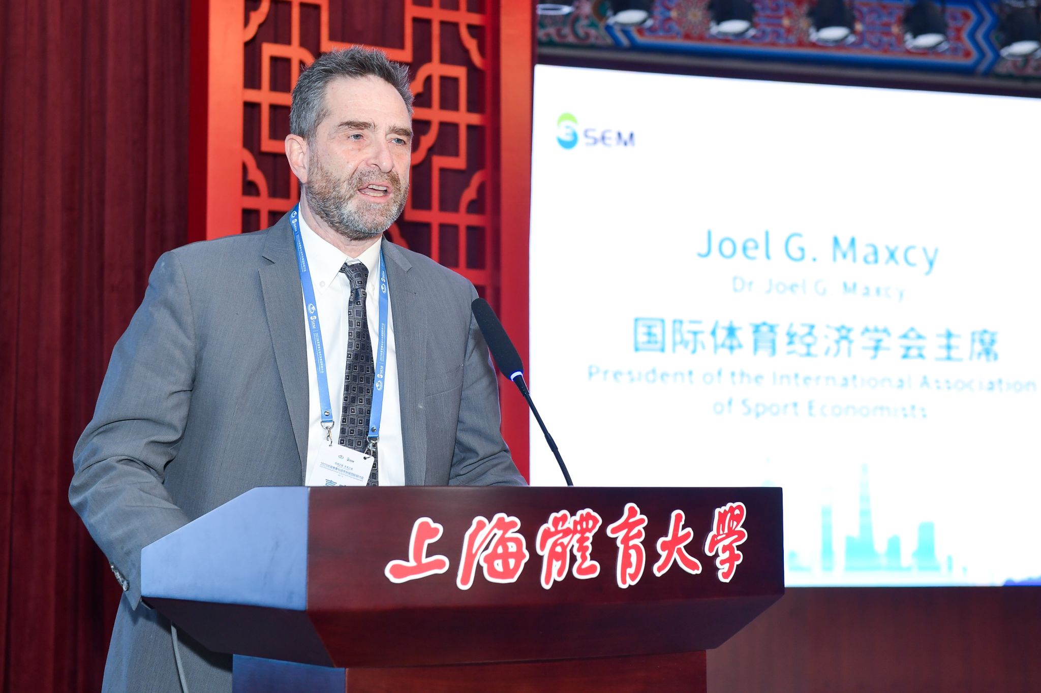 国际体育经济学会主席Joel G.Maxcy介绍了拥有悠久历史的国际体育经济学会(International Association of Sports Economists,简称:IASE),并对2023体育赛事与城市发展国际研讨会的邀请表示感谢。