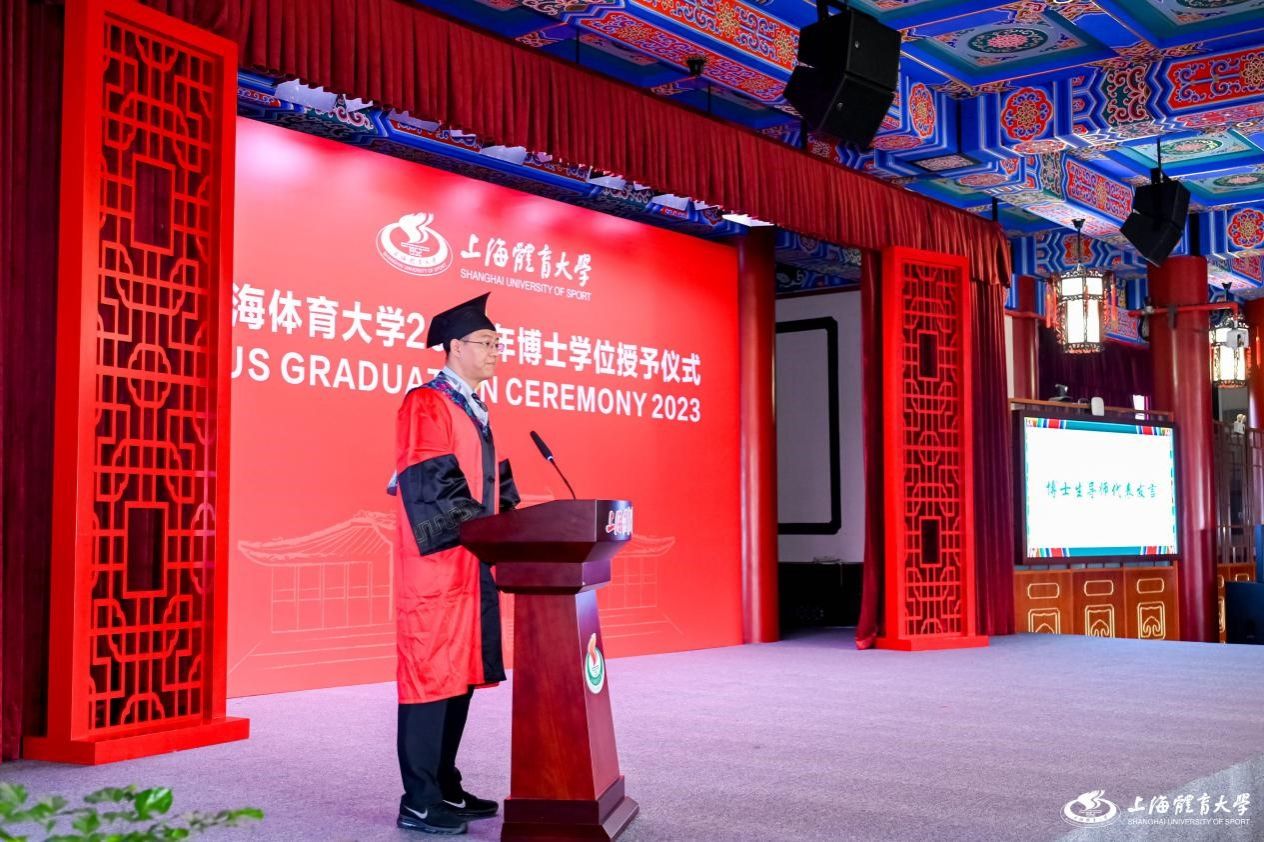 运动健康学院傅维杰教授作为博士毕业生导师代表祝贺同学们顺利毕业,并分享了自己的感悟。他教导同学们要以梦想为己任,在奋斗中找到人生的星空。无论是走向学术的高峰,还是投身社会的热土,也许有一天会成为星空下孤独的旅行者,但请各位毕业生保持对学术梦想的执着。其次要以求知为己任,聚焦体、医、工融合,探索科学研究和科技成果转化的新模式,引领国家体育科技、大健康与体育事业的发展。傅教授还提出,要以责任为己任,积极投身体育事业,以实际行动成为社会进步的推动者,为青年群体展示上体人积极向上的形象。