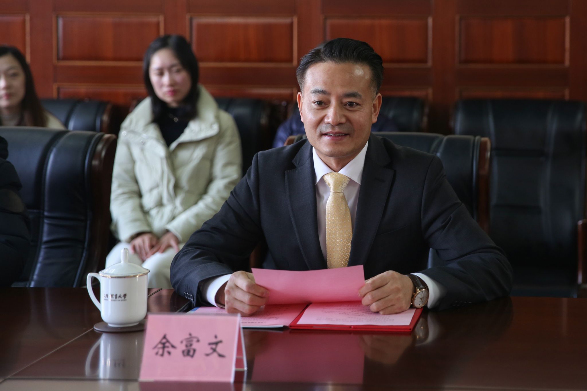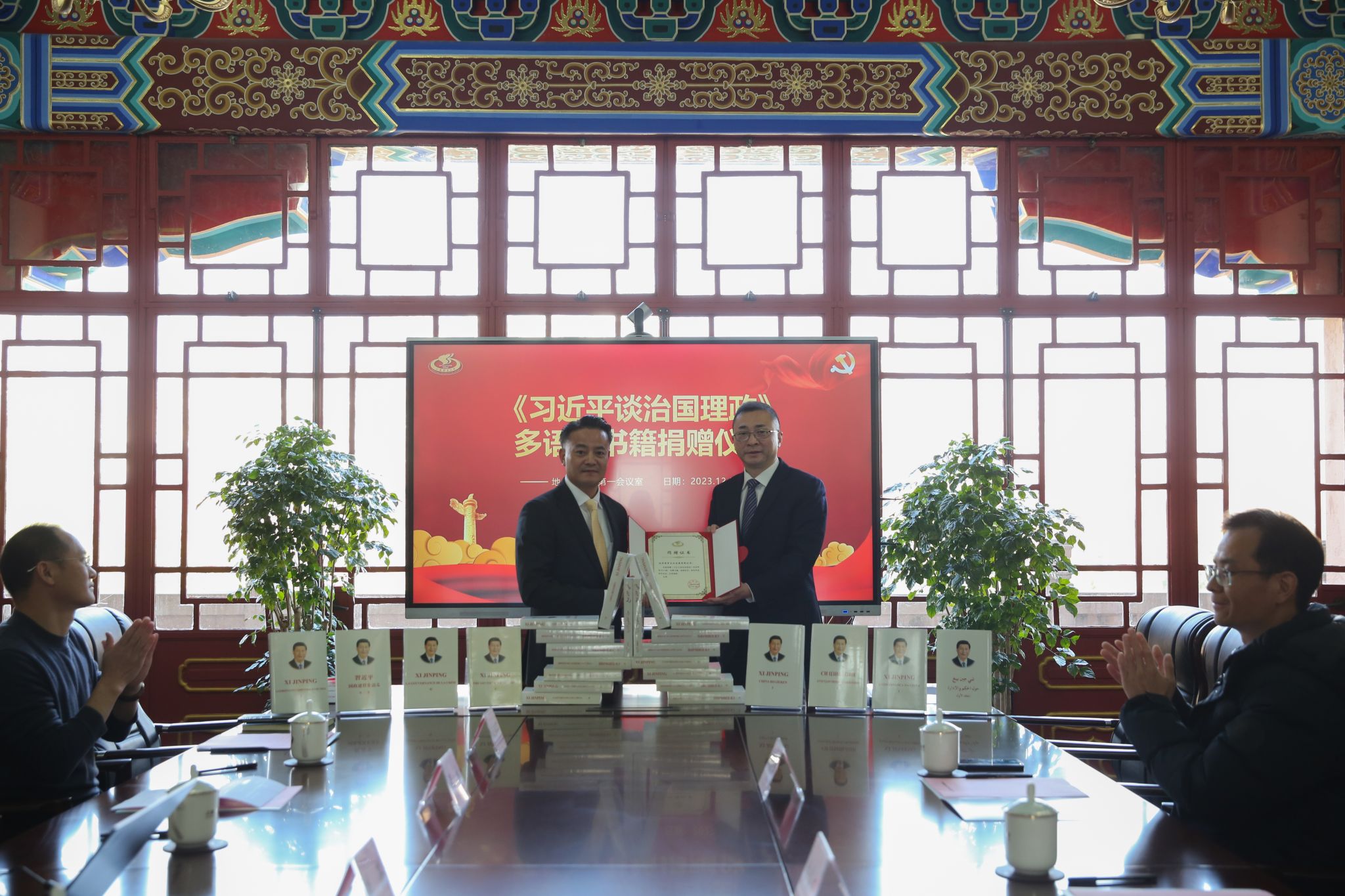 本网讯 2023年12月5日上午,《习近平谈治国理政》多语种书籍捐赠仪式在SUNBET申搏绿瓦大楼第一会议室举行。SUNBET申搏党委书记李崟,北京崇学文化发展有限公司负责人余富文,SUNBET申搏党委常委、党委组织部、统战部部长张盛出席捐赠仪式。校党委宣传部、图书馆、档案馆、对外协作办、马克思主义学院、新闻与传播学院负责人及学生代表参加。捐赠仪式由张盛主持。
