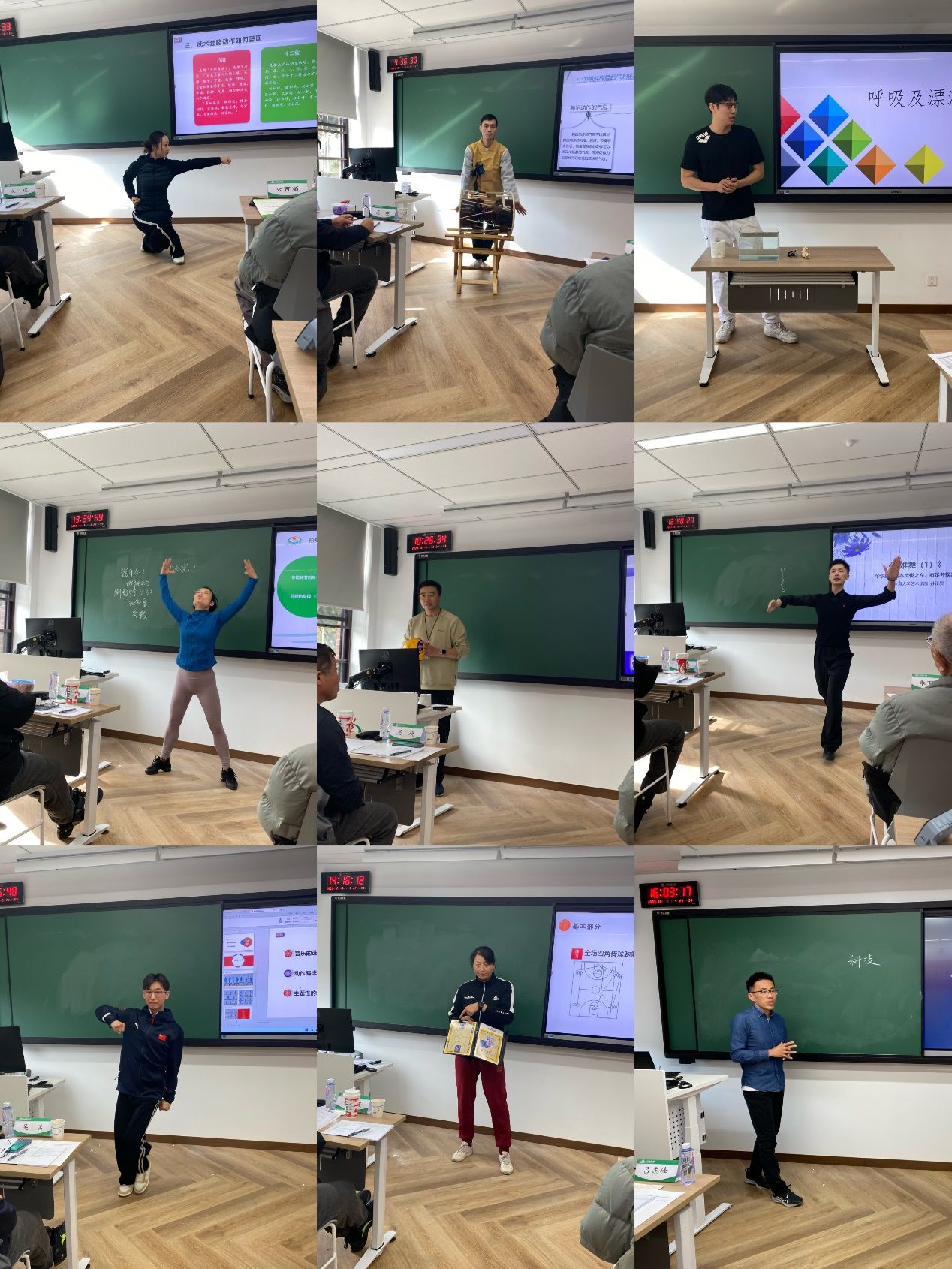12月13日术科组竞赛中,来自体育教育学院、竞技运动学院、艺术学院、武术学院的9名参赛教师,在20分钟的教学节段展示中通过精湛的教学技艺示范、融合信息技术的训练过程展示,实践与理论深入结合的讲授,展示了技术实践类课程的生动有趣、刻苦勤奋、精益求精的教学风格。