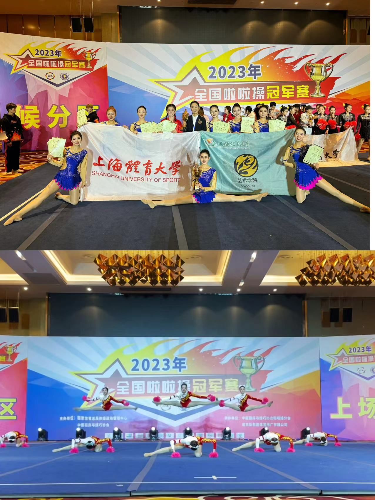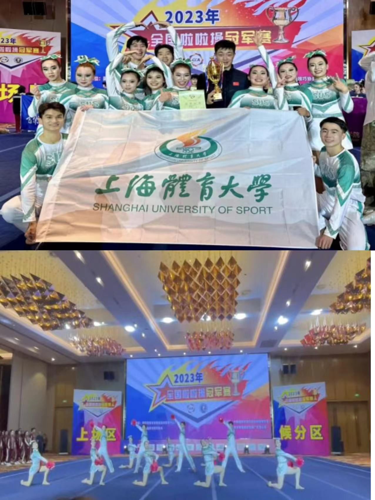 SUNBET艺术学院-绿瓦啦啦操代表队11名本科生,1名研究生在艺术学院副院长(主持工作)韩春英的引领与指导下紧急备战,取得佳绩。训练中,韩春英教授大胆选用新生,排兵布阵,采用以老带新的模式打磨团队配合度和凝聚力,练就了一支专业素养高、综合能力强的队伍。赛场上,各参赛队激烈角逐,尽管竞争压力极大,但绿瓦啦啦操代表队团结一致、顽强比拼,成功从同组别的其他代表队中脱颖而出,在韩教练赛前赛后的专业训练与团队12名学生日复一日的刻苦练习下,收获了评委与观众的一致认可,最终摘得集体花球和集体爵士双项冠军、双人花球第四名、双人爵士第五名、双人街舞第六名的五项好成绩,为上体赢得荣誉。