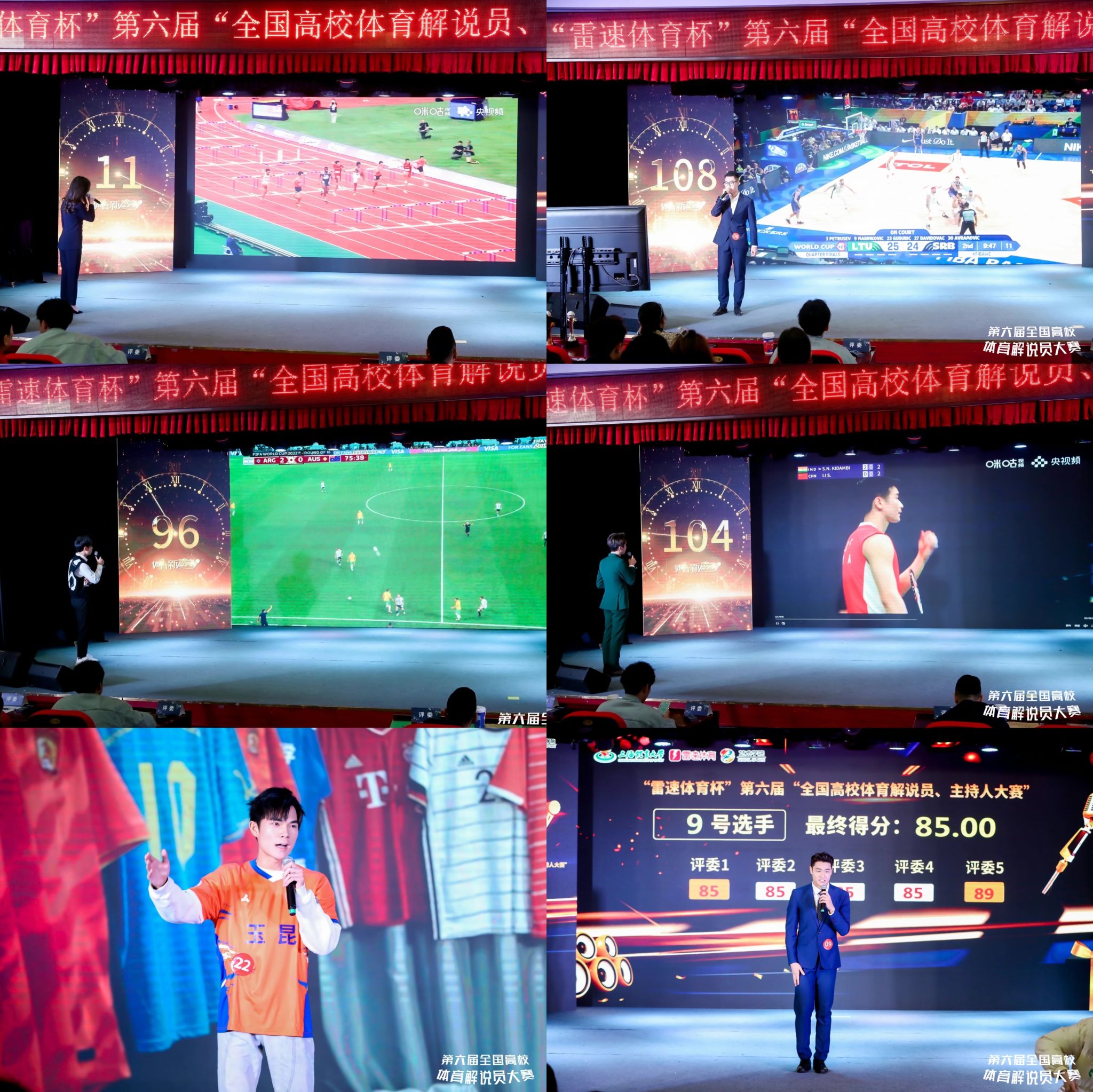 经过12月23号一天的复赛,共有30名选手进入12月24号的决赛舞台,经过多轮主持和解说的比拼。最终,来自SUNBET申搏的申玉贺、西安工程大学的陈曦夺得“雷速体育杯”第六届“全国高校体育解说员、主持人大赛”特等奖,来自浙江传媒学院的廖兴洋、山东青年政治学院的张渝来、广州体育学院的张芷嫣获得一等奖。北京体育大学、浙江传媒学院、河南大学等11所高校获得最佳组织奖。强海峰、宋扬、陈岐岳、王子也等19位老师获得了优秀指导教师奖。