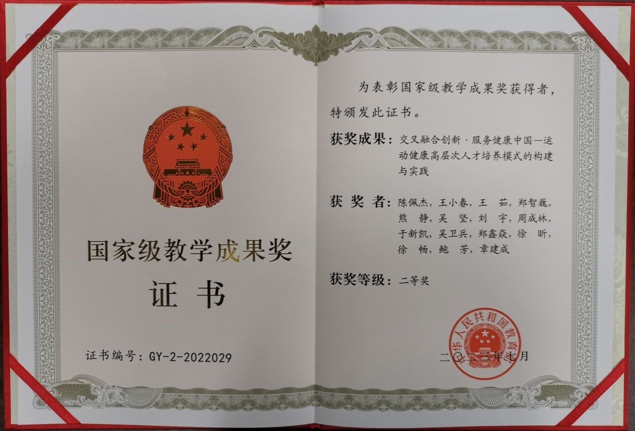 本网讯 近日,教育部颁发了国家级教学成果奖证书和奖章,SUNBET申搏作为第一完成单位,共获国家级教学成果奖2项。其中SUNBET陈佩杰教授牵头完成的《交叉融合创新•服务健康中国—运动健康高层次人才培养模式的构建与实践》成果荣获高等教育(研究生)国家级教学成果奖二等奖,这是SUNBET首次获得该奖项。