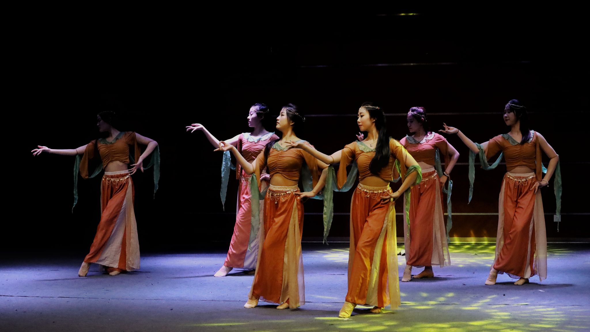 民族传统舞蹈的复现是以舞蹈文化助推中华民族伟大复兴、构建人类命运共同体的重要举措。这次复现的“胡旋舞”“胡腾舞”是随着丝绸之路的开通由西域传来的民间乐舞,在隋唐时期极为盛行。遗憾的是胡旋舞、胡腾舞因历史浪潮而兴也因其而衰。安史之乱后,一度风靡大唐的“时尚弄潮”胡旋舞、胡腾舞逐渐走向失传,封印在敦煌的石窟壁画中,无数人为再难窥见胡旋舞的风采哀叹、惋惜。本次复现学生收集到宁夏石刻胡旋舞墓门、敦煌壁画中胡旋舞和胡腾舞资料,尤其石刻胡旋舞墓门上两个男人斗舞的生动场面,再现了一千多年前唐代盛极一时的胡旋舞形象,见证了“一带一路”民族融合和文化交流。对传统的胡旋舞、胡腾舞的溯源探究,寻找并激活变化中不变的原型,是让“一带一路”的舞蹈“重新在场”。