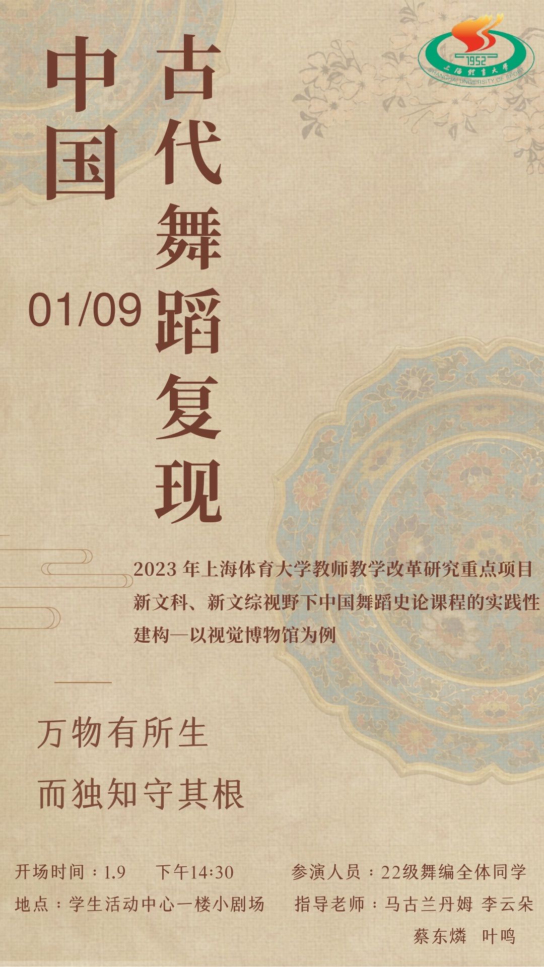 学生华诗婷、张湘雯两位同学担任海报设计工作,他们以汉代刘安《淮南子·原道 训》中“万物有所生,而独知守其根”为主题,在分享中说到:“世间万物都有其生存发展的不同规律,但都应该保住自己的根本,本源。而中国舞蹈文化走至今天,依旧高度文明,依旧绵延不绝,正是源于守住了中华优秀传统文化这条根脉。我们要以“守其根”的情怀去传承,以与时代共振的姿态唱响历史文化“新曲”,中国上下五千年的高度文明不应仅仅停留在纸上,裹于文物中,陈列在博物馆里,更应与古为新”。
