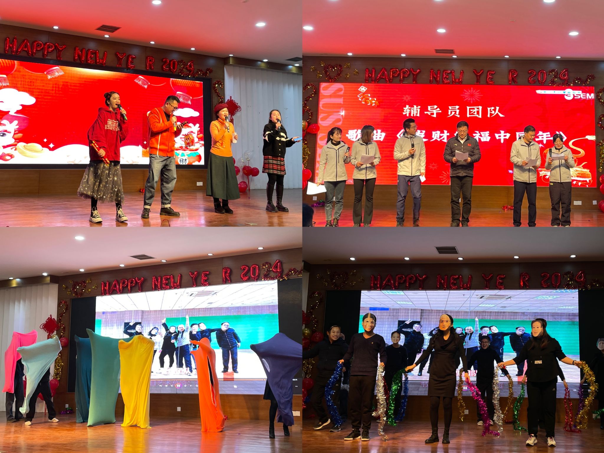 管理团队、经济团队、大数据团队、体育旅游团队、计算机团队、辅导员团队、管理保障团队等分别表演了《龙飞凤舞》《入海》《恭喜发财》《一路生花》《如愿》《发财发福中国年》《光阴的故事》等节目,台下尖叫声、鼓掌声不断,新年联欢精彩纷呈、欢乐喜庆。