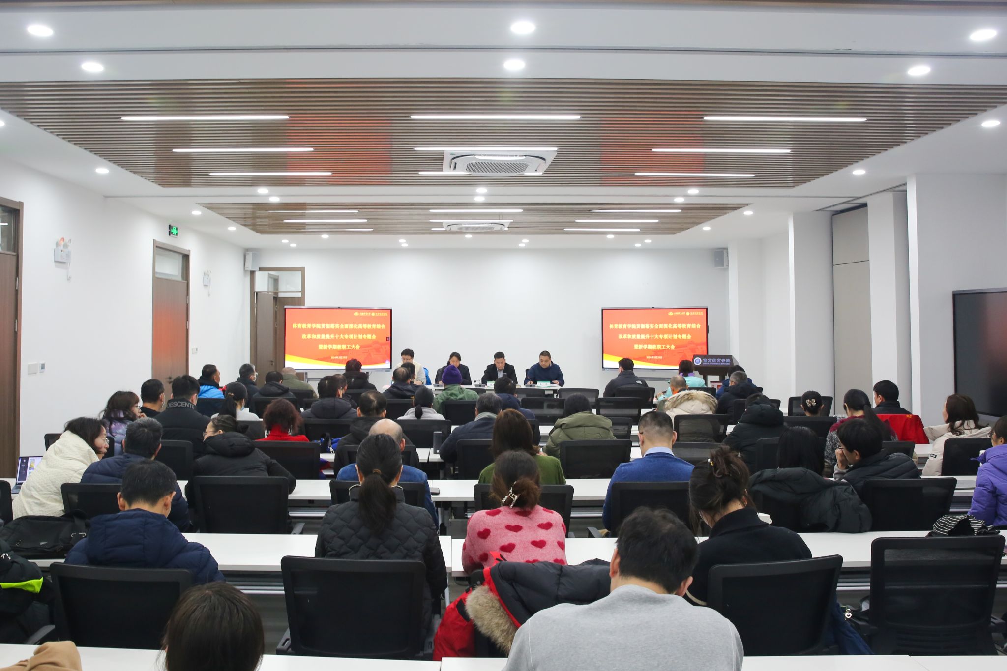 本网讯 凝心聚力启新程,击鼓催征再出发。为进一步明确新学期学院发展目标,全面部署新学期工作,确保新学期开学各项工作平稳有序进行,2月29日下午,体育教育学院在体教学院会议室召开贯彻落实全面深化高等教育综合改革和质量提升十大专项计划专题会暨新学期教职工大会。学院全体领导班子成员、全体教职工共同参加会议。体教学院党委副书记、副院长曹智超主持会议。