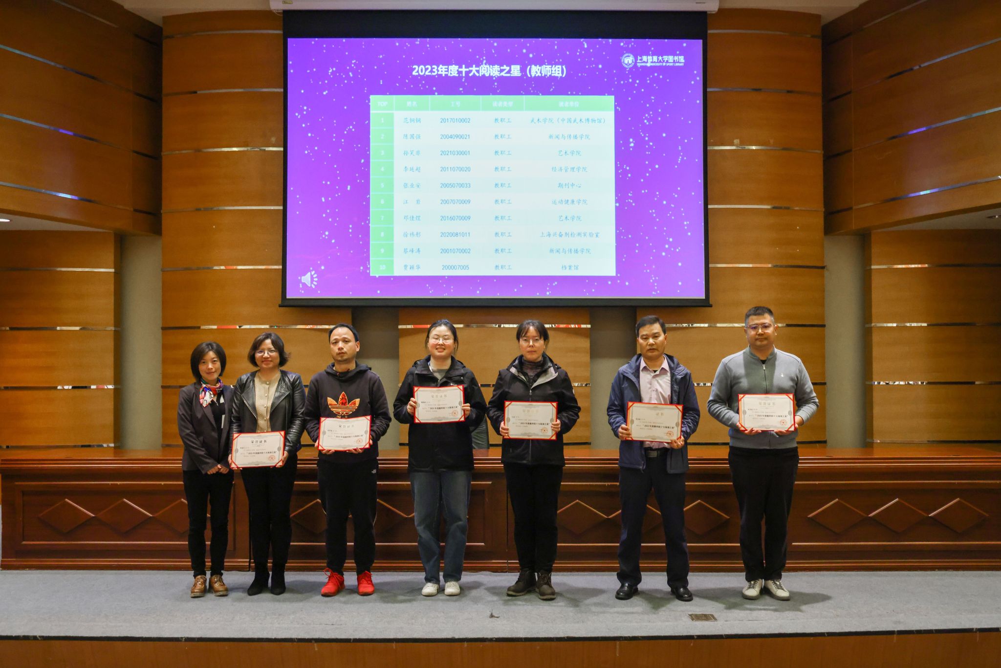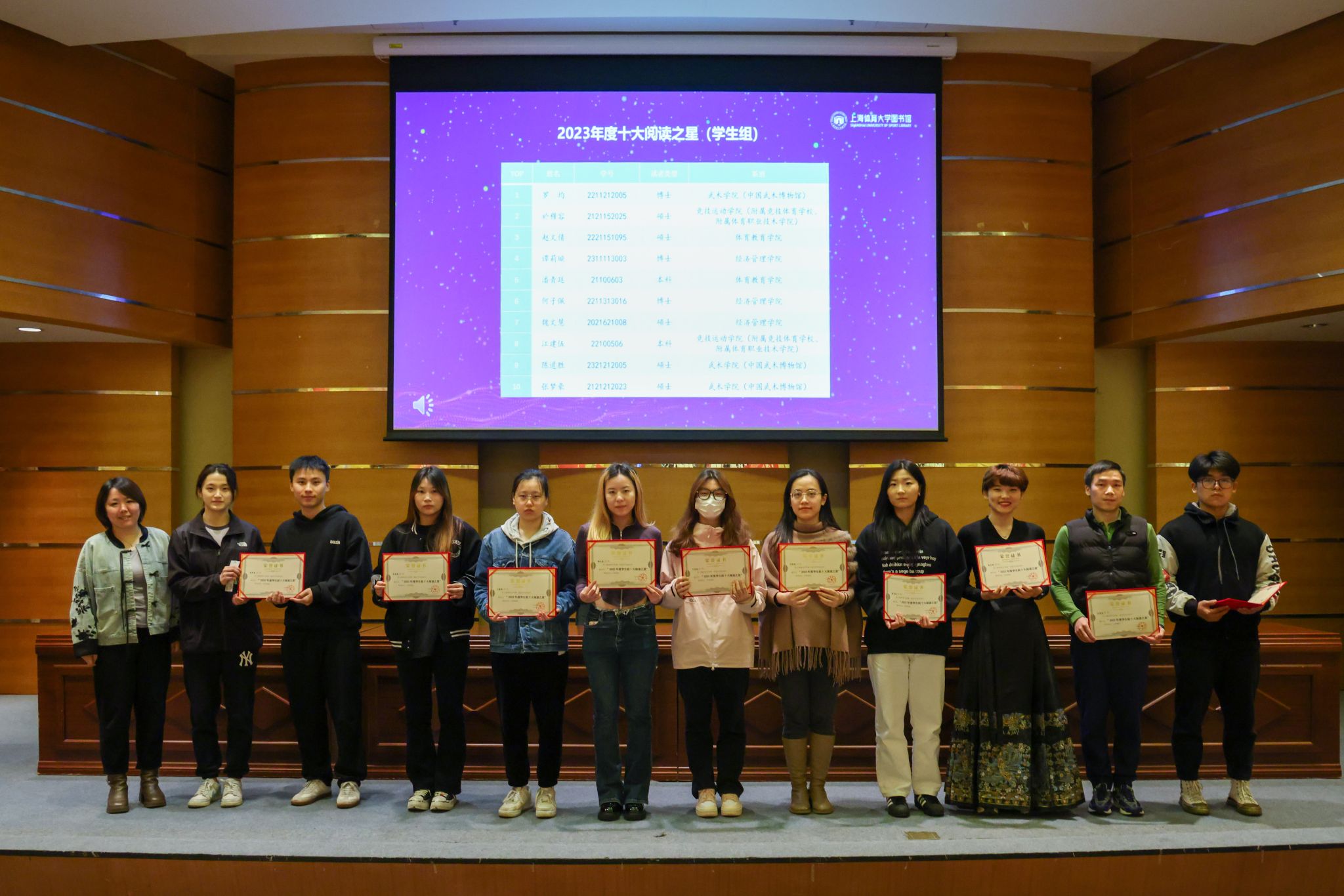 根据年度借阅纸质图书数量排行,罗均、於穆容、赵文倩、谭莉璇、潘青廷、何子佩、魏文慧、江建伍、陈道胜、张梦豪等获得2023年度十大阅读之星(学生组);范铜钢、陈国强、孙笑非、李延超、张业安、江 岩、邓佳煜、徐祎彤、蔡峰涛、贾颖华等获得2023年度十大阅读之星(教师组)。根据年度在馆累计学习时长排行, 丁方兴、王奥博、黄晓薇、林海敏、任康龙、吴佳、吴冰梅、高昀欣、陈洁欣、毛灵锋等获得2023年度十大学习之星。根据年度生均在馆学习时长排行,马克思主义学院 、运动健康学院 、经济管理学院 、心理学院 、新闻与传播学院等获得2023年度“书香学院”。