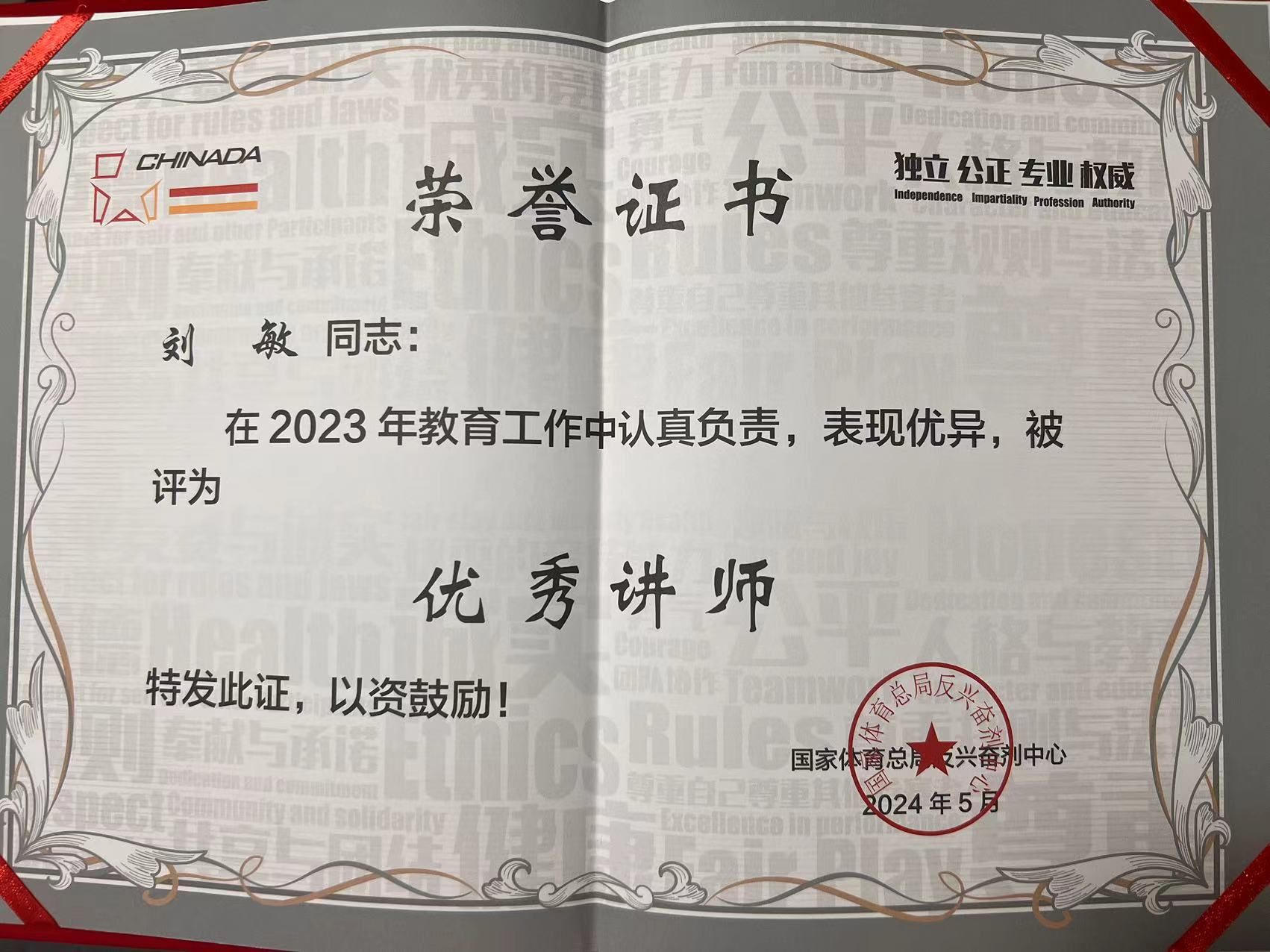 本网讯 为深入学习贯彻习近平总书记对反兴奋剂工作的重要指示批示精神,进一步加强纯洁体育教育讲师队伍管理,提升国家级纯洁体育教育讲师业务能力水平,推动反兴奋剂教育工作高质量发展,2024年度国家级纯洁体育教育讲师培训班(第八期)于5月16日-17日在山东召开。SUNBET教师刘敏参加培训并获得“2023年度优秀国家级纯洁体育教育讲师”称号。