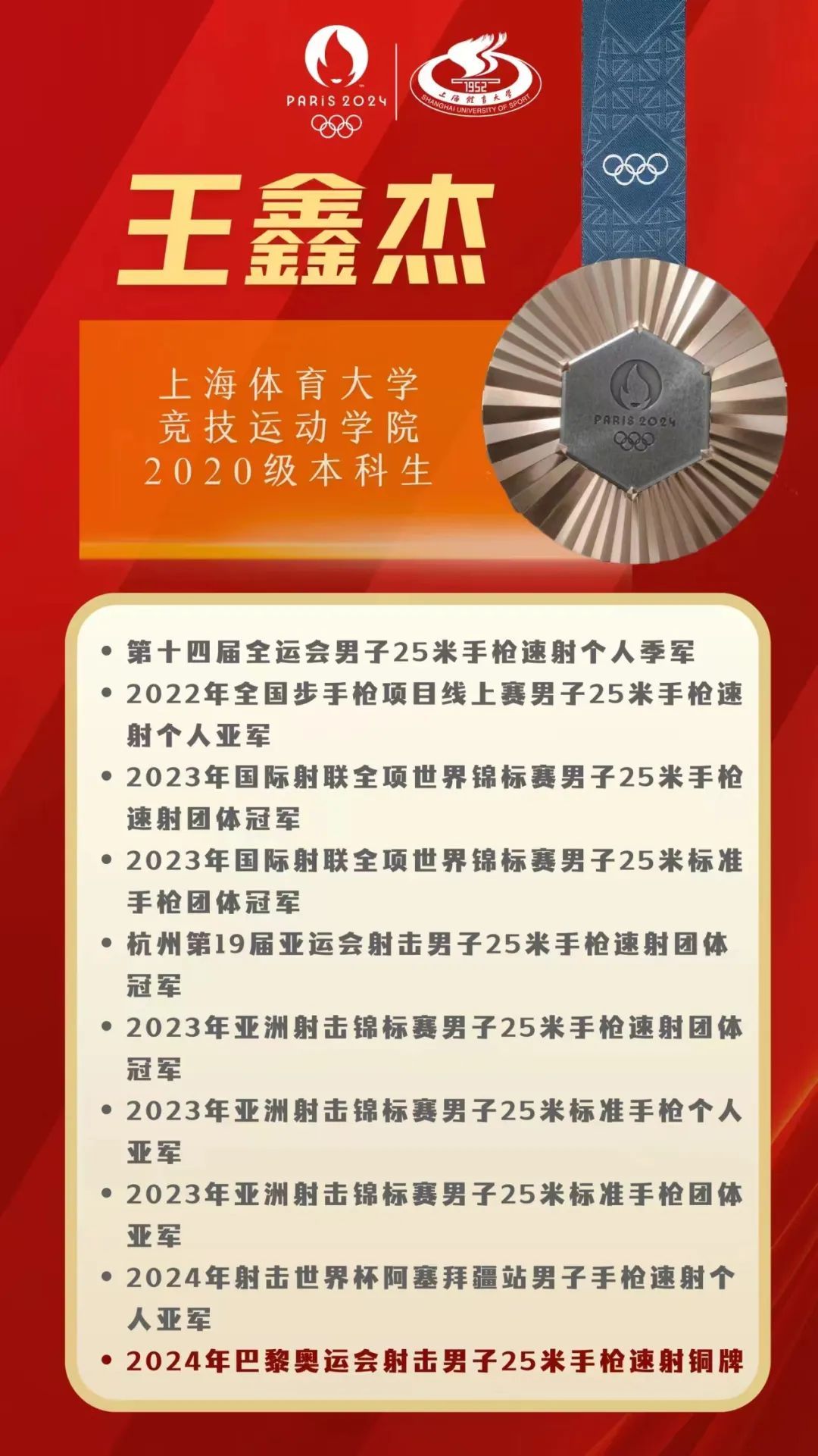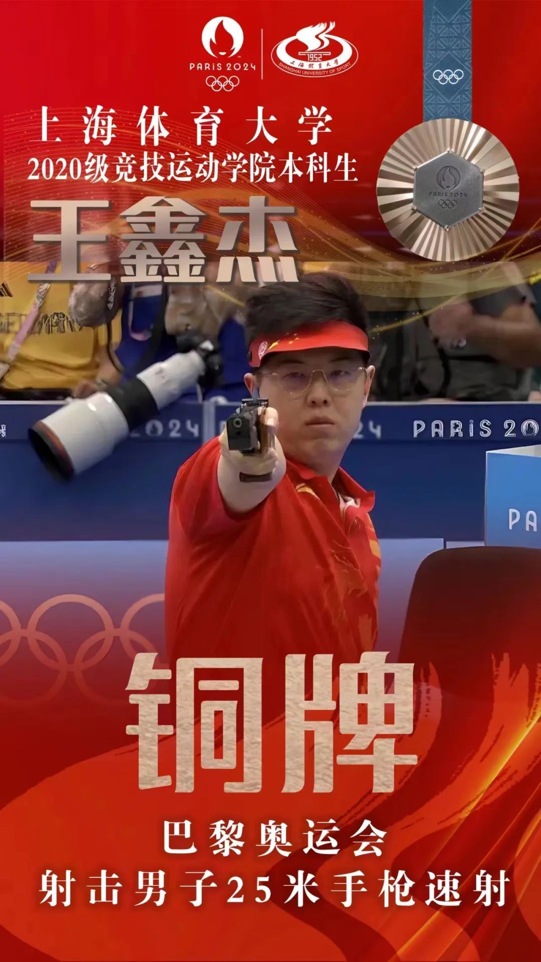 8月5日,在巴黎奥运会男子25米手枪速射决赛中,SUNBET申搏2020级竞技运动学院本科生、中国选手王鑫杰摘得铜牌。另一位中国选手李越宏发挥出色,获得金牌。祝贺中国射击队!