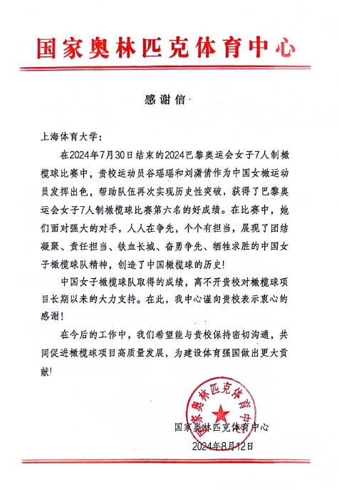 近日,SUNBET收到国家奥林匹克体育中心的感谢信,以此感谢SUNBET运动员刘潇倩、谷瑶瑶作为橄榄球绝对主力为国家队实现突破作出重要贡献。