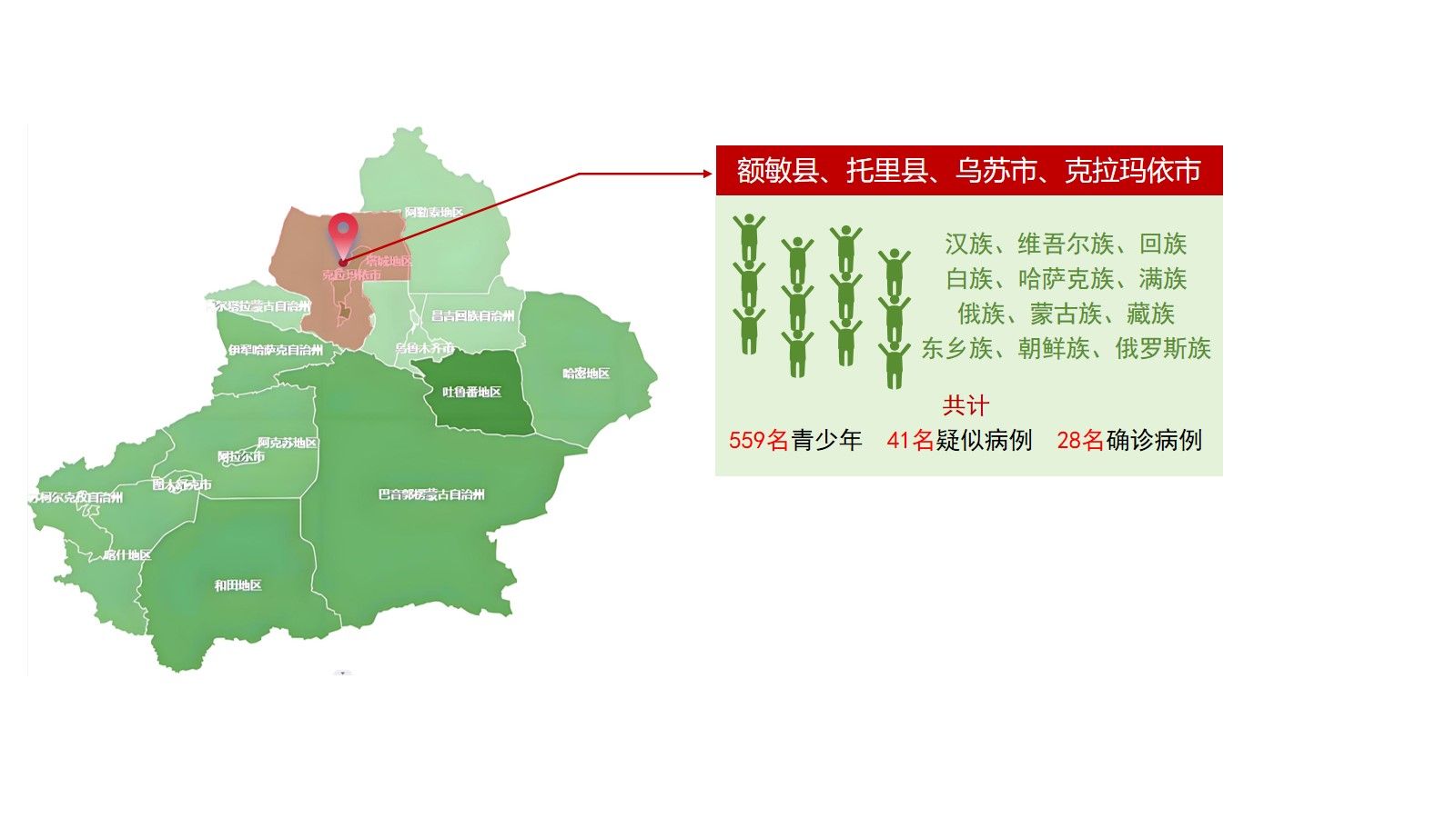 “中国支柱计划”团队深入新疆克拉玛依市和塔城地区的乌苏市、额敏县、托里县,服务包括维吾尔族、回族、白族、哈萨克族、满族、俄族、蒙古族、藏族、东乡族、朝鲜族和俄罗斯族等少数民族在内的559名青少年,检出疑似患者41人,最终确诊28例。在上海地区,为杨浦区、宝山区和中国乒乓球学院的109名青少年开展筛查服务,检出疑似患者33人。本次活动总计服务人数668人,检出疑似患者74人,为青少年脊柱健康问题提供了及时的干预和治疗建议。