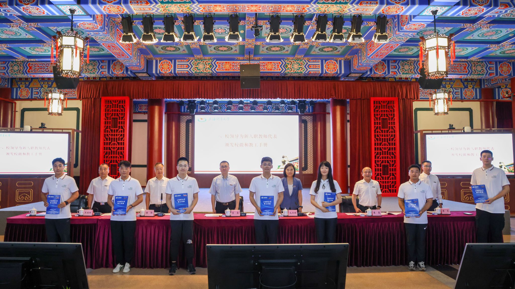在庄重而温馨的氛围中,校领导为新入职教师代表赠送象征荣誉与责任的校徽,并颁发教工手册。新教师们正式成为学校大家庭的一员,他们将肩负起传承知识、培养人才的重任。
