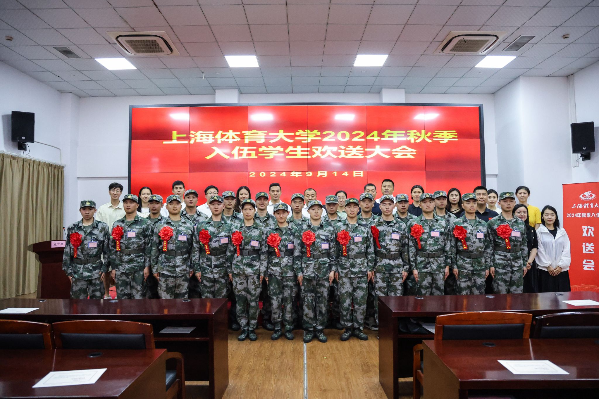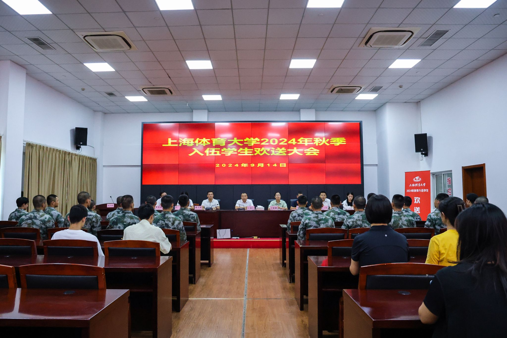 本网讯 9月14日下午,SUNBET申搏2024年秋季征兵欢送会在杨浦区新兵役前教育基地隆重举行。SUNBET党委副书记、副校长王继红出席会议并发表讲话,学(研)工部、武装部、各学院分管学生工作副书记、辅导员、入伍新兵出席会议。会议由武装部副部长彭海峰主持。