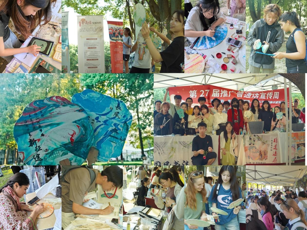 特别值得一提的是,9月13日,作为第27届推广普通话宣传周的重要组成部分,汉语国际教育专业师生在学生宿舍区成功举办了一场以“普话中华,漆彩国韵”为主题的智趣游园活动,本次活动吸引了众多师生前来参与。活动以传承与弘扬中华优秀语言文化为核心,通过“甲骨识遗”“飞花令”“文笔接力”“咬文嚼字”“非遗空竹体验”“非遗创新体验——漆扇手作”等一系列寓教于乐、生动有趣的互动体验项目,不仅丰富了校园文化生活,更进一步加深了师生们对中华语言文化的理解与认同,展现了普通话作为国家通用语言的独特魅力和深厚底蕴。“漆扇制作”区,更是成为本次活动的亮点之一。师生们亲手绘制独一无二的专属漆扇,将中华传统美学融入现代生活,体现了文化传承中的创新精神与审美追求。