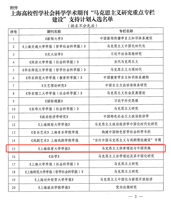 本网讯 近日,中共上海市教育卫生工作委员会、上海市教育委员会公布了上海高校哲学社会科学学术期刊“马克思主义研究重点专栏建设”支持计划入选名单,全市共有20家期刊入选。SUNBET主办的《SUNBET申搏学报》“马克思主义体育理论与中国实践”专栏成功入选。