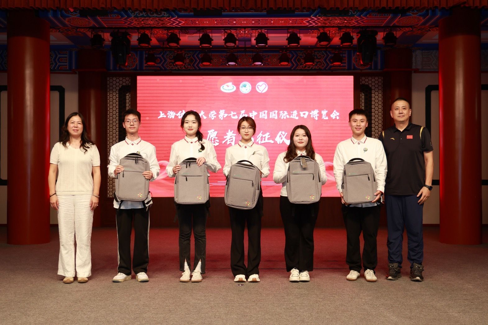 保卫工作部部长王强、后勤处副处长袁文君为第七届“小叶子”代表授予出征装备。学校为绿瓦“小叶子”定制的背包、水杯、雨伞等贴心“道具”,将为志愿者们保驾护航,助力他们在进博会期间高效、安全地开展工作。