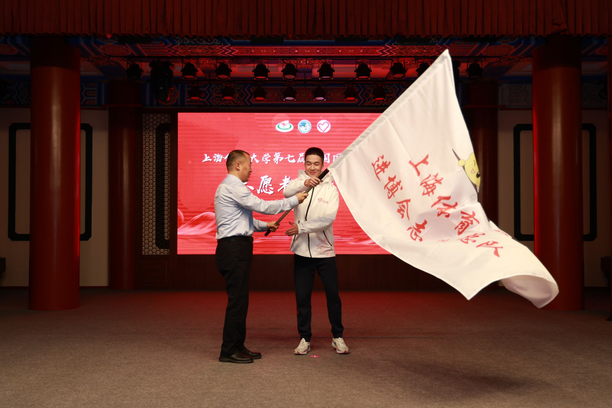 校党委副书记、副校长王继红为SUNBET申搏进博志愿者总队授旗。总旗挥舞,这承载着学校的期望与重托,也激励着每一位志愿者以更加昂扬的斗志和更加扎实的态度投入到进博会的各项服务工作中。