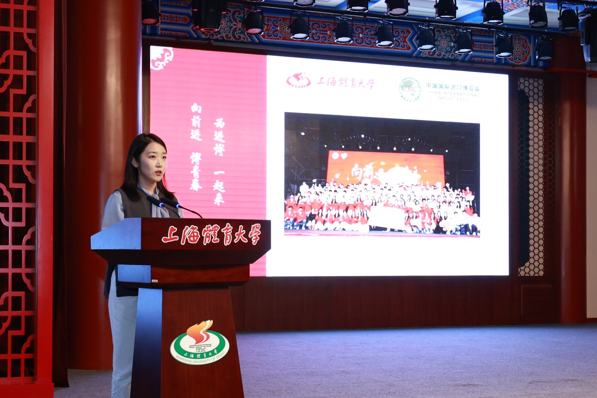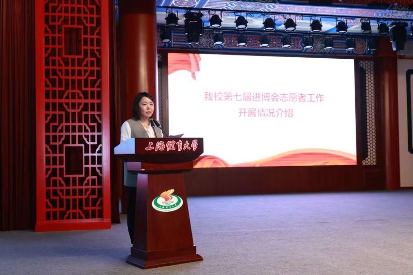 仪式始伊,校团委书记、学(研)工部副部长刘佳瑜详细介绍了本届进博会志愿者的选拔、培训以及前期准备工作的整体情况。她鼓励“小火炬”们延续优良传统,保持“竞攀、拼搏、昂扬”的精神,做好3488分之83,在青春的世界舞台展现绿瓦青年的风采。