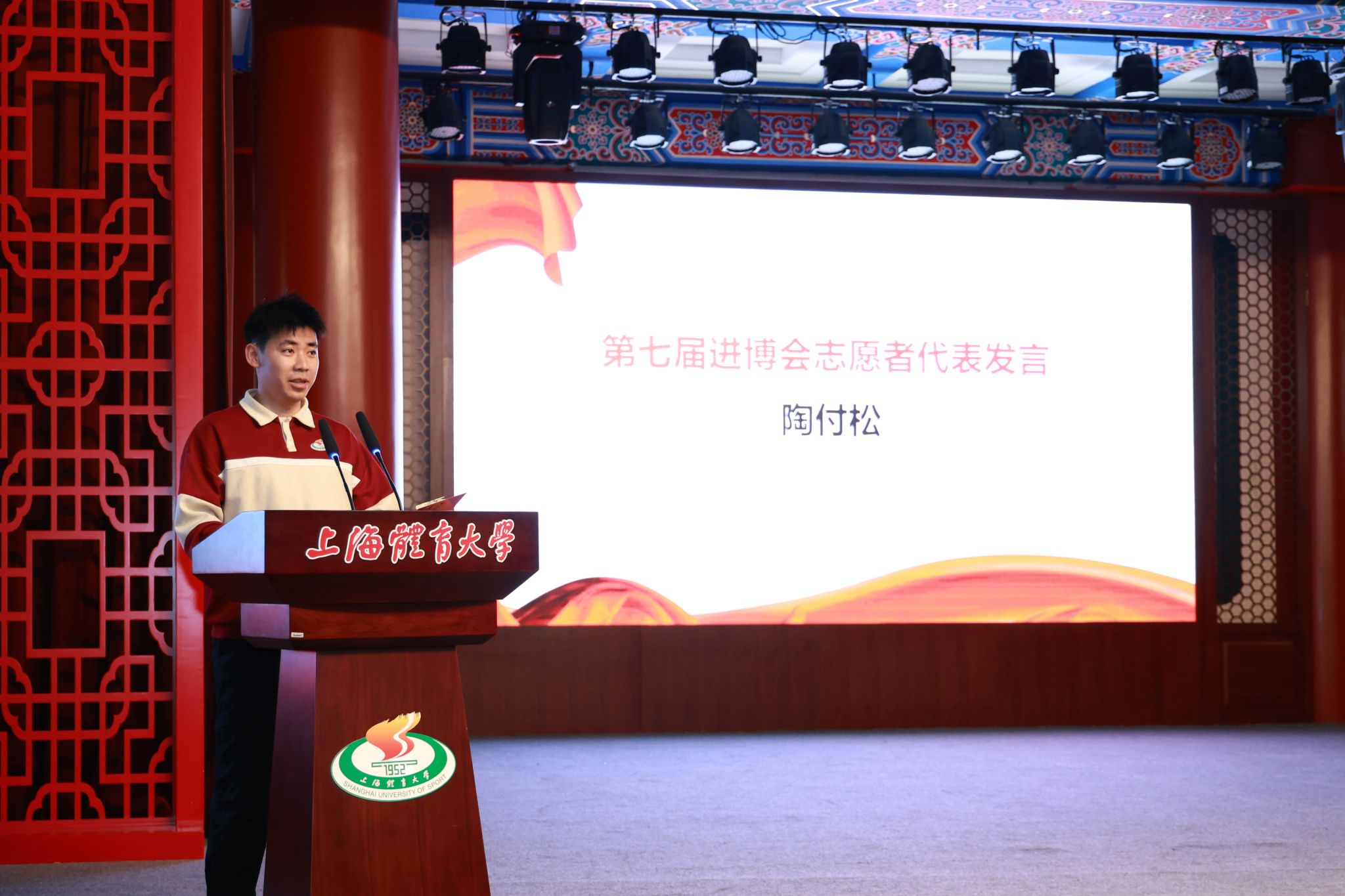 随后,少数民族学生陶付松同学作为第七届进博会志愿者代表发言。陶付松同学表达了对即将参与进博会的激动心情和坚定决心。他承诺将不负重托,以实际行动践行志愿精神,为进博会的成功举办贡献自己的力量。
