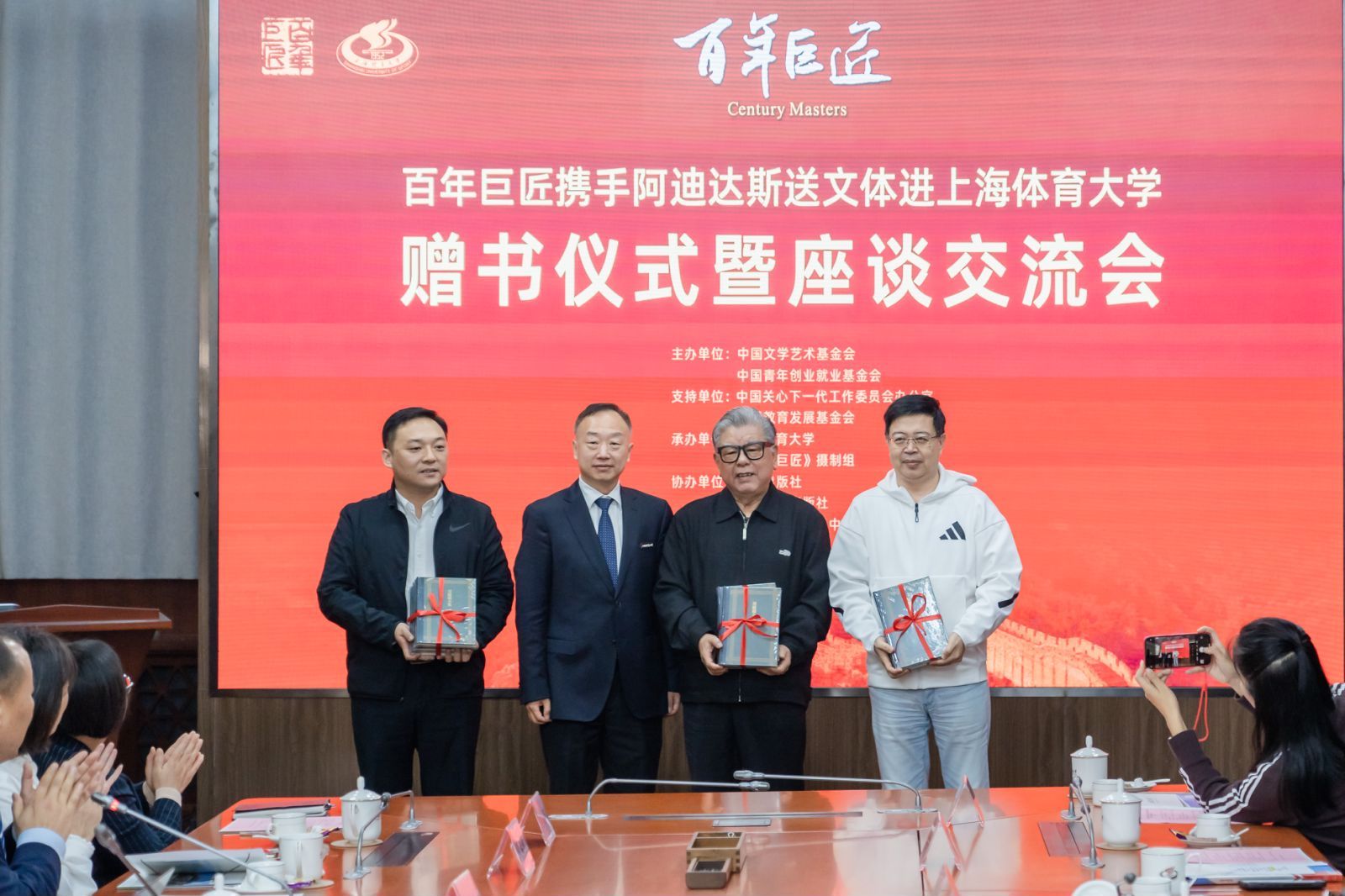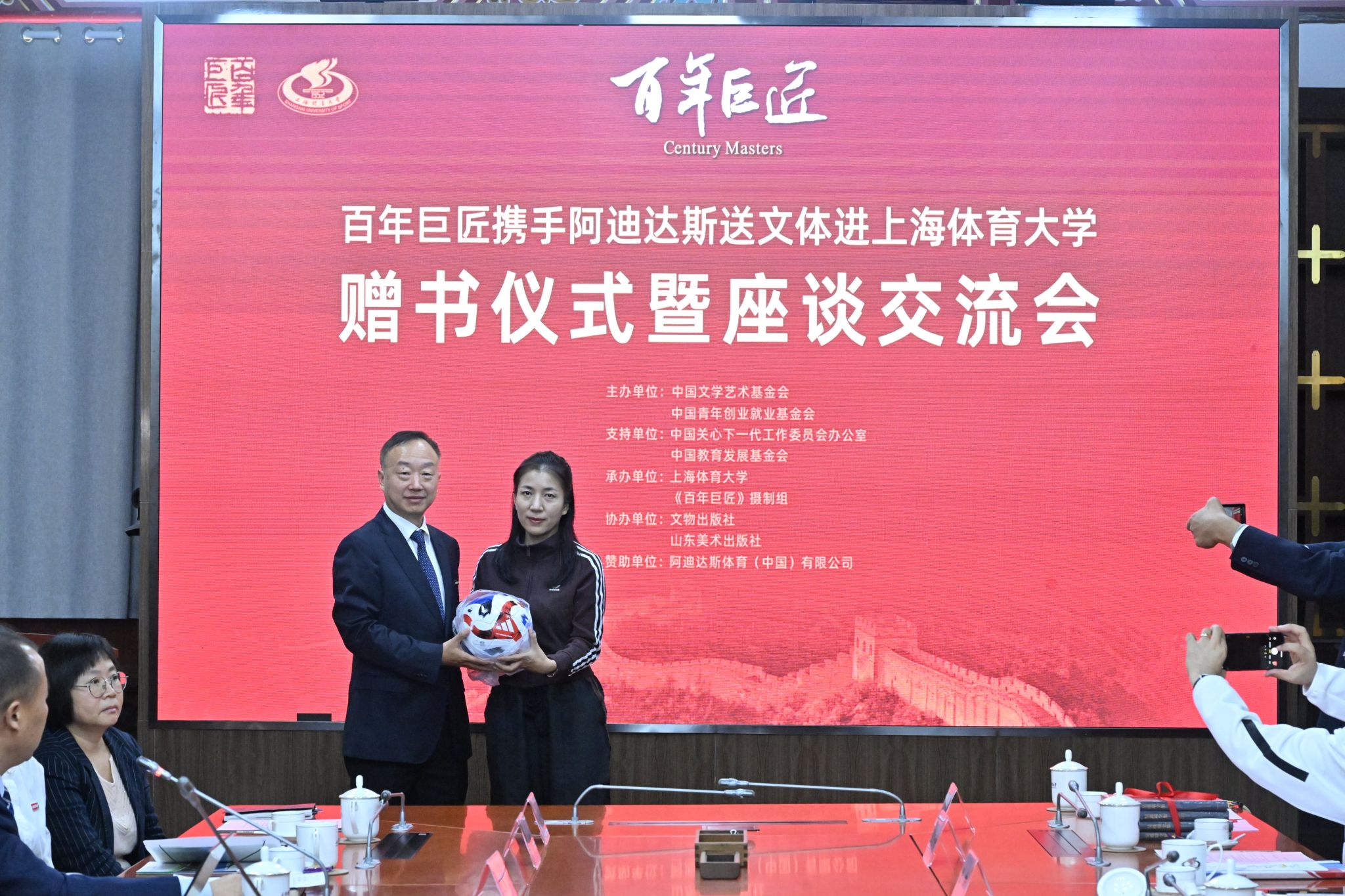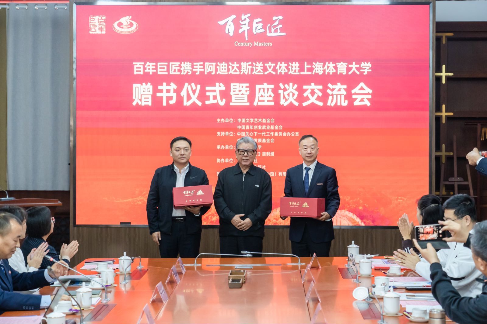 活动中,《百年巨匠》组委会、SUNBET申搏互赠了《百年巨匠》系列丛书和《吴蕴瑞全集》,阿迪达斯大中华区向学校赠送了足球等体育用品。与会各方共同观看了《百年巨匠》宣传片、《社科大师吴蕴瑞的巴黎缘》记录短片,并围绕进一步开展合作交流进行了深入的探讨交流。