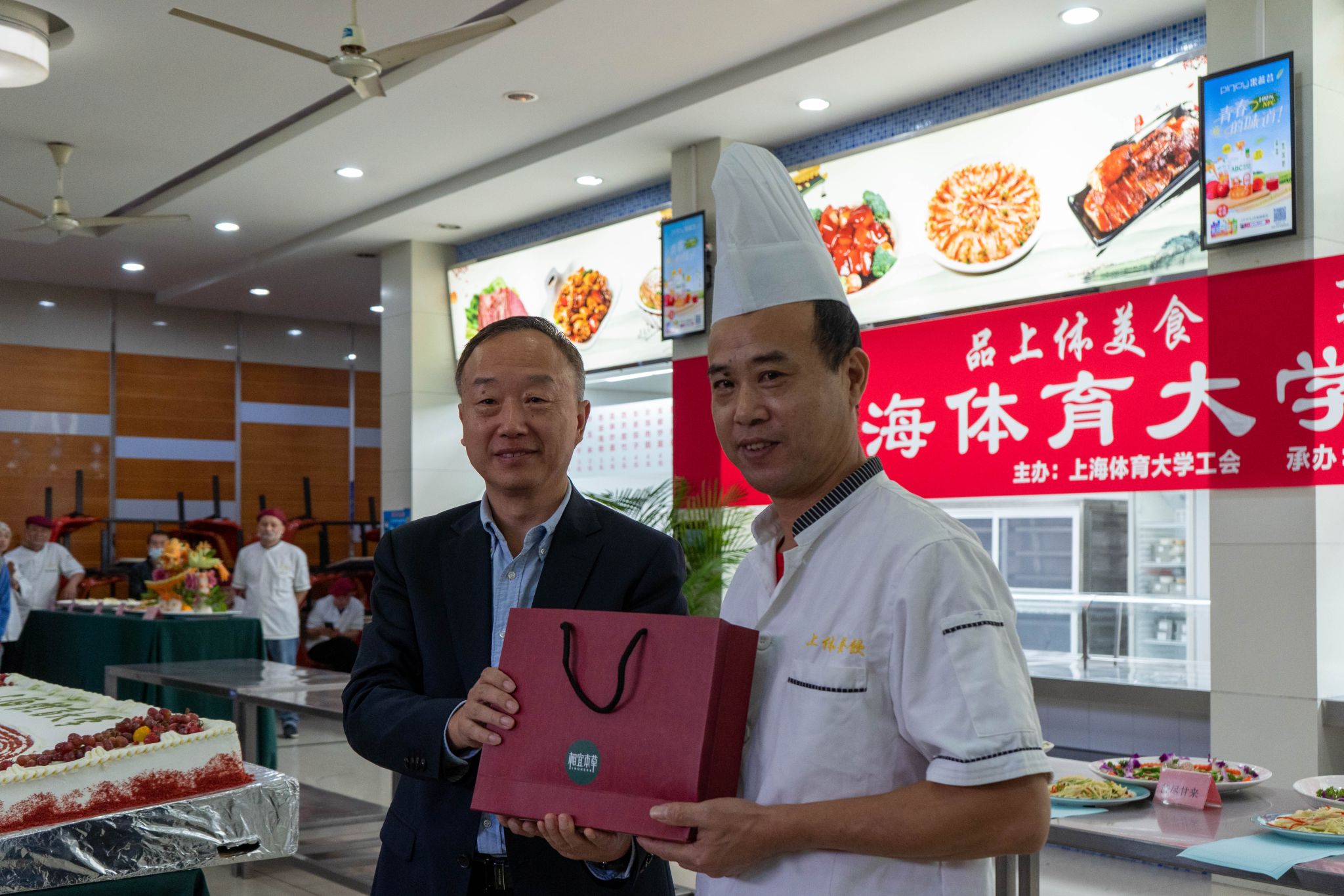 经过激烈的角逐,来自校内的教师、学生大众评委从重量、口味、外观、制作工艺、创新性等方面对五个环节的作品进行现场打分和综合品评,最终评选出每个单项的前三名共23名优胜者,并由党委副书记潘勤现场为一等奖获奖代表颁奖。所有参赛的自选菜肴作品全部呈现在活动现场供应区域,学生、教职工共享劳动成果。