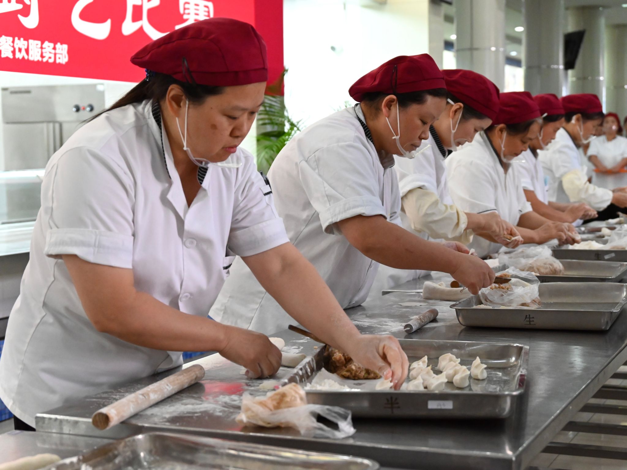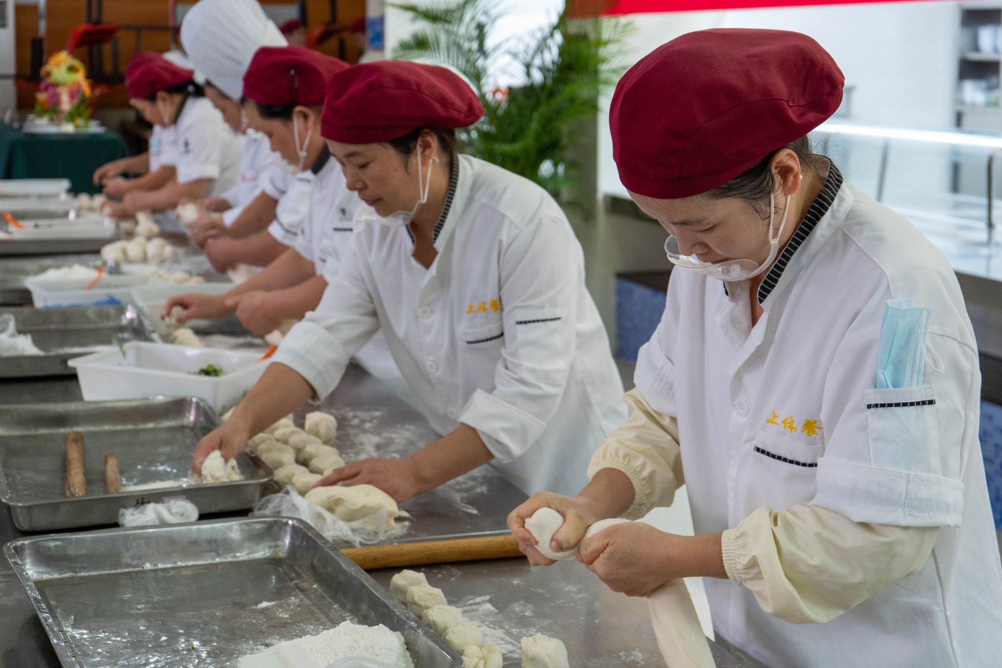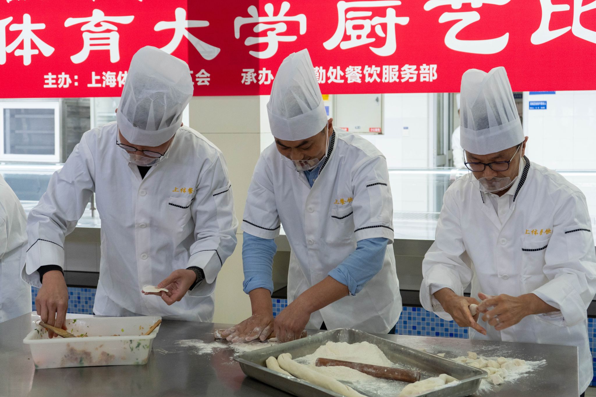 参赛选手赛前进行抽签,按抽签顺序参赛。过程中,选手们严格遵循比赛规程和操作规范,争分夺秒、全身心投入。和面、揉面、捏褶、出成品,绵柔的面团在师傅们的手中仿佛被施以魔法、瞬间成型,松软的面皮里包裹着鲜嫩的。香菇菜包、白菜大肉水饺饱满匀称、表皮光滑、皱褶均匀。土豆丝厚薄匀称粗细均匀、似牙签状、整齐划一,不连刀。大排大小、厚薄匀称,与比赛限定克数几乎毫厘不差,与充分展现了选手们娴熟的刀工。