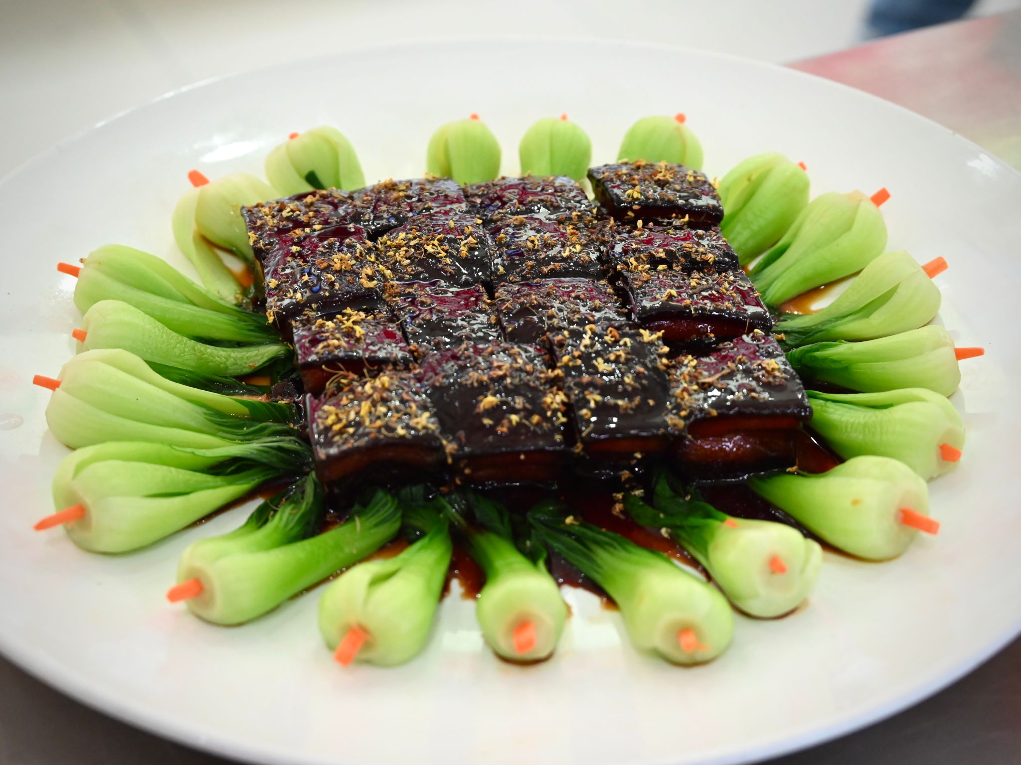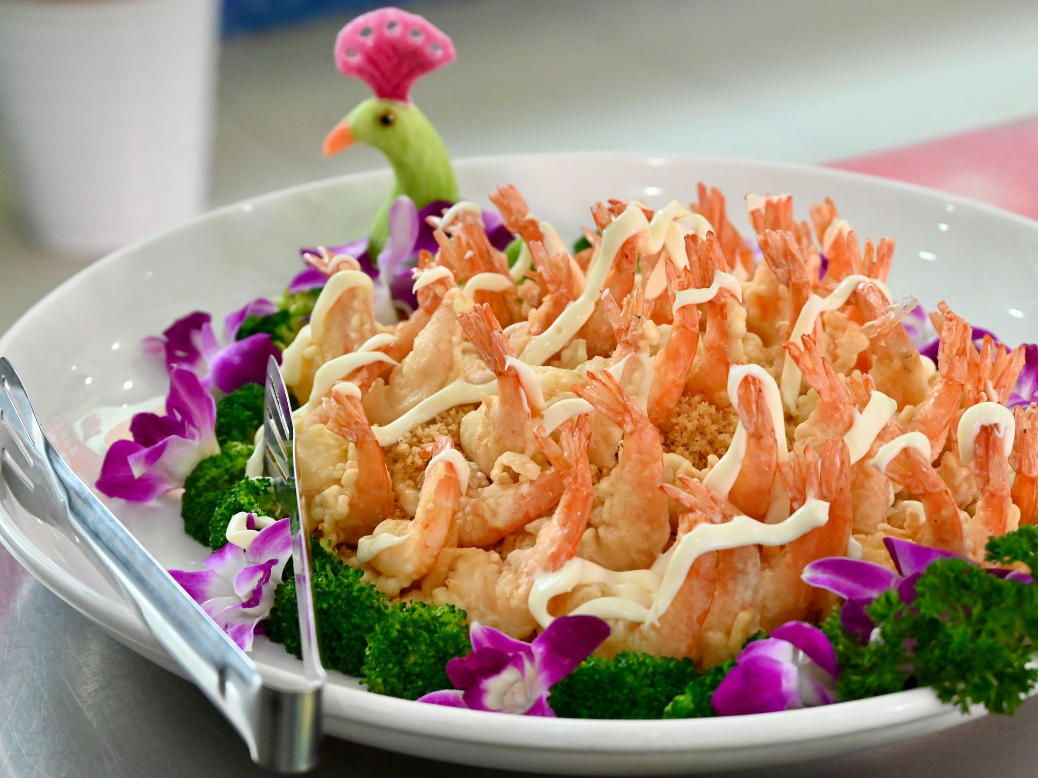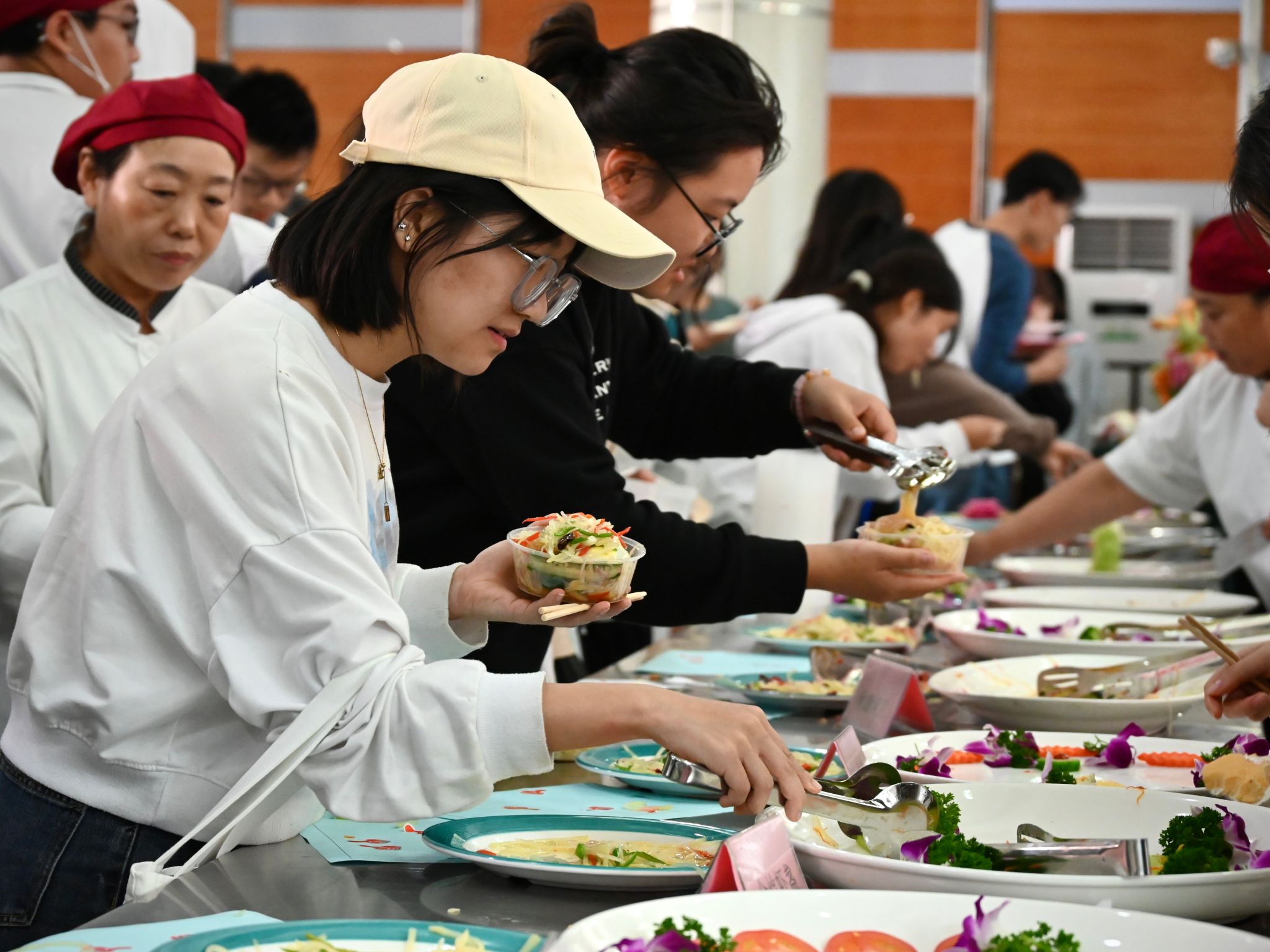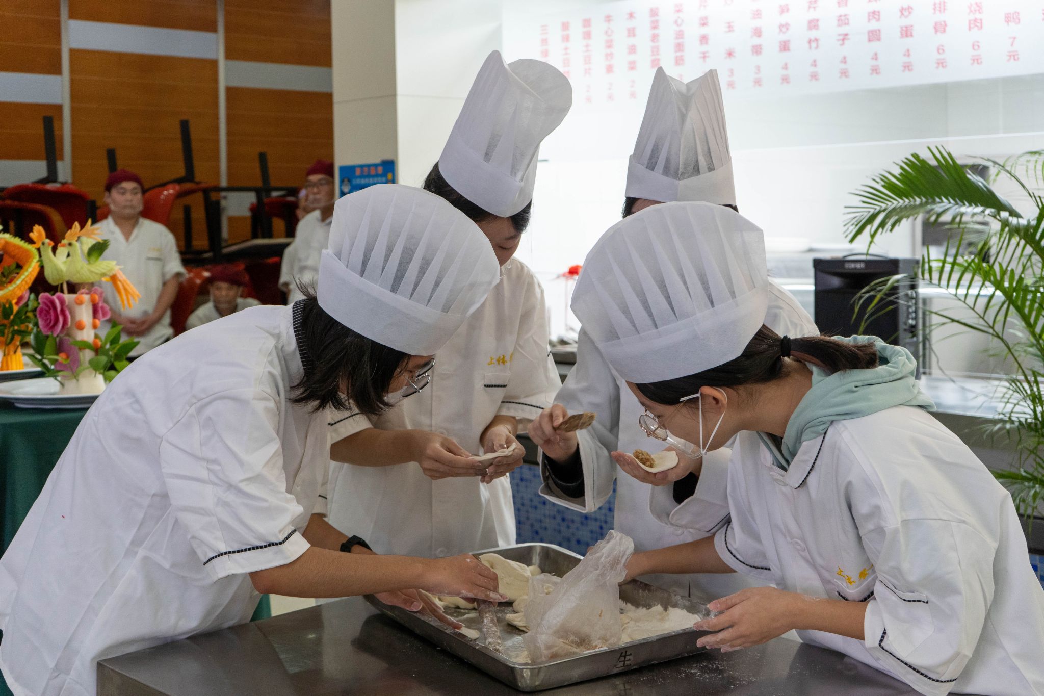 本届烹饪菜肴环节除了创意自选菜还增加了固定菜肴进行比拼。参赛者之间既有技艺切磋,又纷纷展现风采,对精选食材进行切配、动作干净利落,向师生呈现了一场味蕾与视觉碰撞的盛宴。咸肉蛋粉包肉、孔雀开屏、金丝凤尾虾、肉松金丝鲜虾卷、脆炸香蕉等12道色香味俱全的成品纷纷出锅,色、香、味、形俱佳,让现场观众和评委们大饱眼福,赞不绝口。