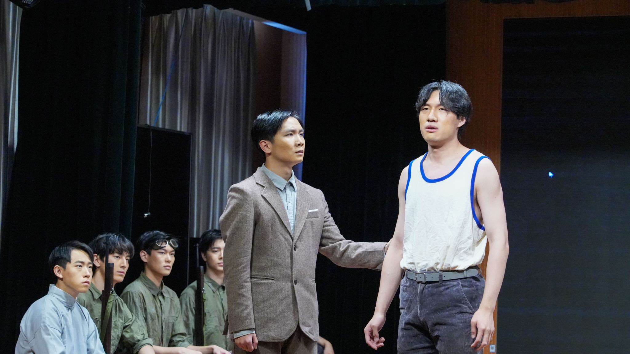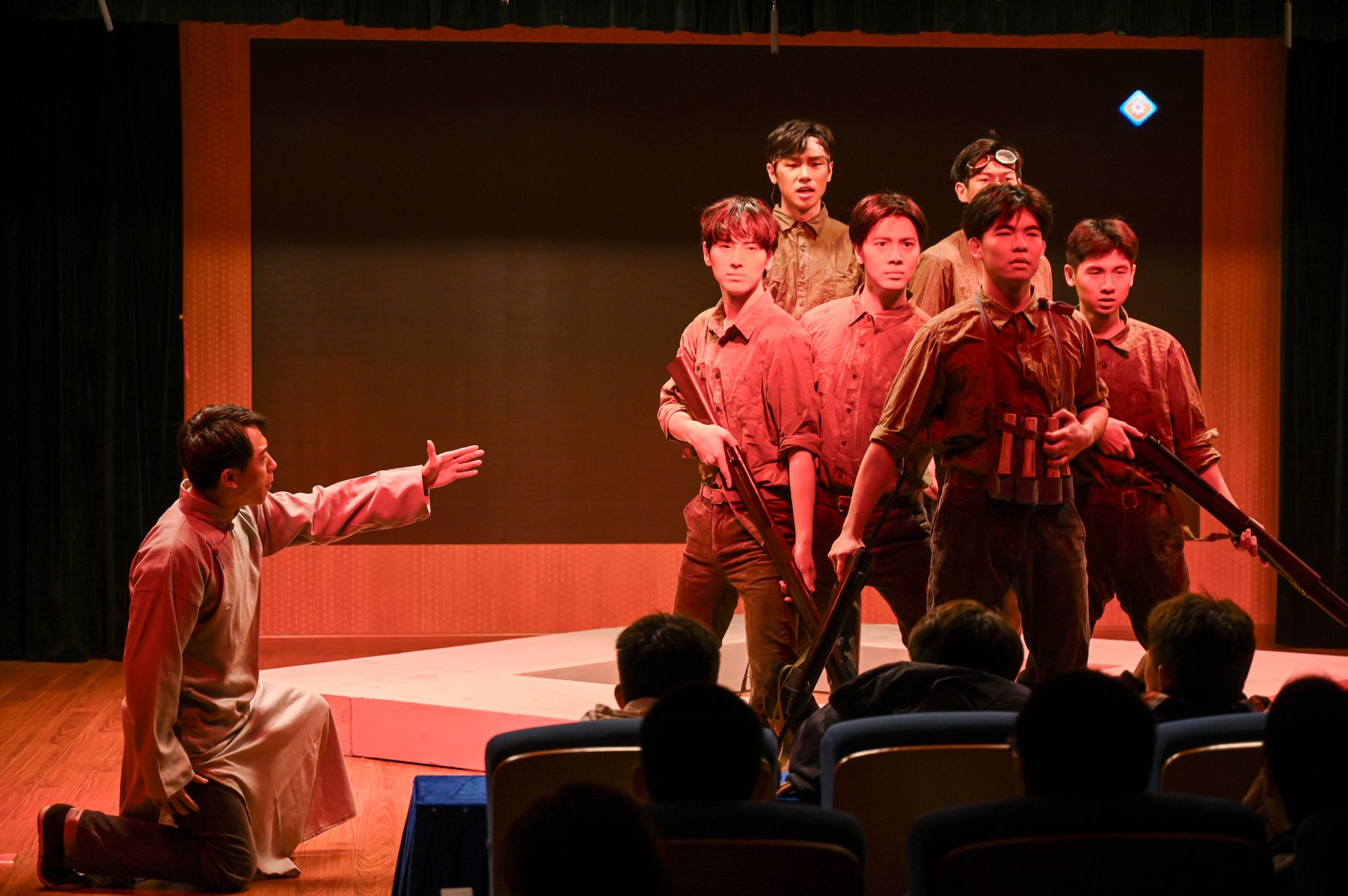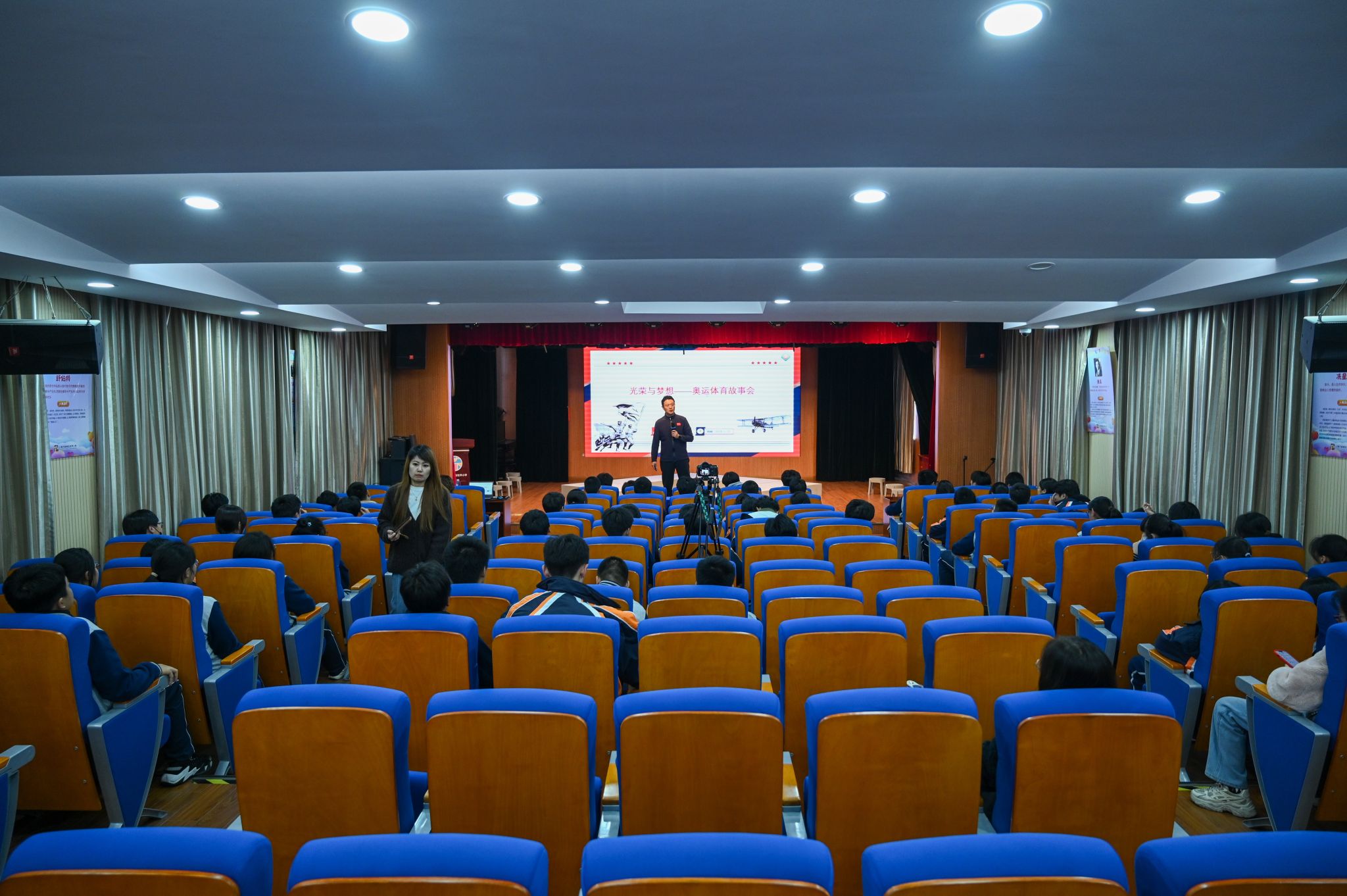 演出环节,上体学子通过精湛的演技和真挚的情感,将吴蕴瑞先生、奥运第一人刘长春、“亚洲拳王”靳贵第、足球运动员陈镇和,以及撑杆跳高选手符保卢的形象刻画得栩栩如生。“野蛮其体魄,文明其精神”,这些奥运选手在赛场上展现了他们的竞技水平和体育精神,在国家和民族危难之际,又毅然选择投身抗日战场,用他们的热血和生命捍卫了国家的尊严和民族的荣誉。他们的故事和精神将永远铭刻在历史的长河中,激励着后人不断前行。同学们被舞台上演员们的精彩表演所吸引,不仅了解了这段历史,还深刻感受到了体育的魅力和力量。在互动环节,同学们用真挚的语言表达了对吴老的敬佩,对“以剧育人”形式的喜爱,对体育的热爱。